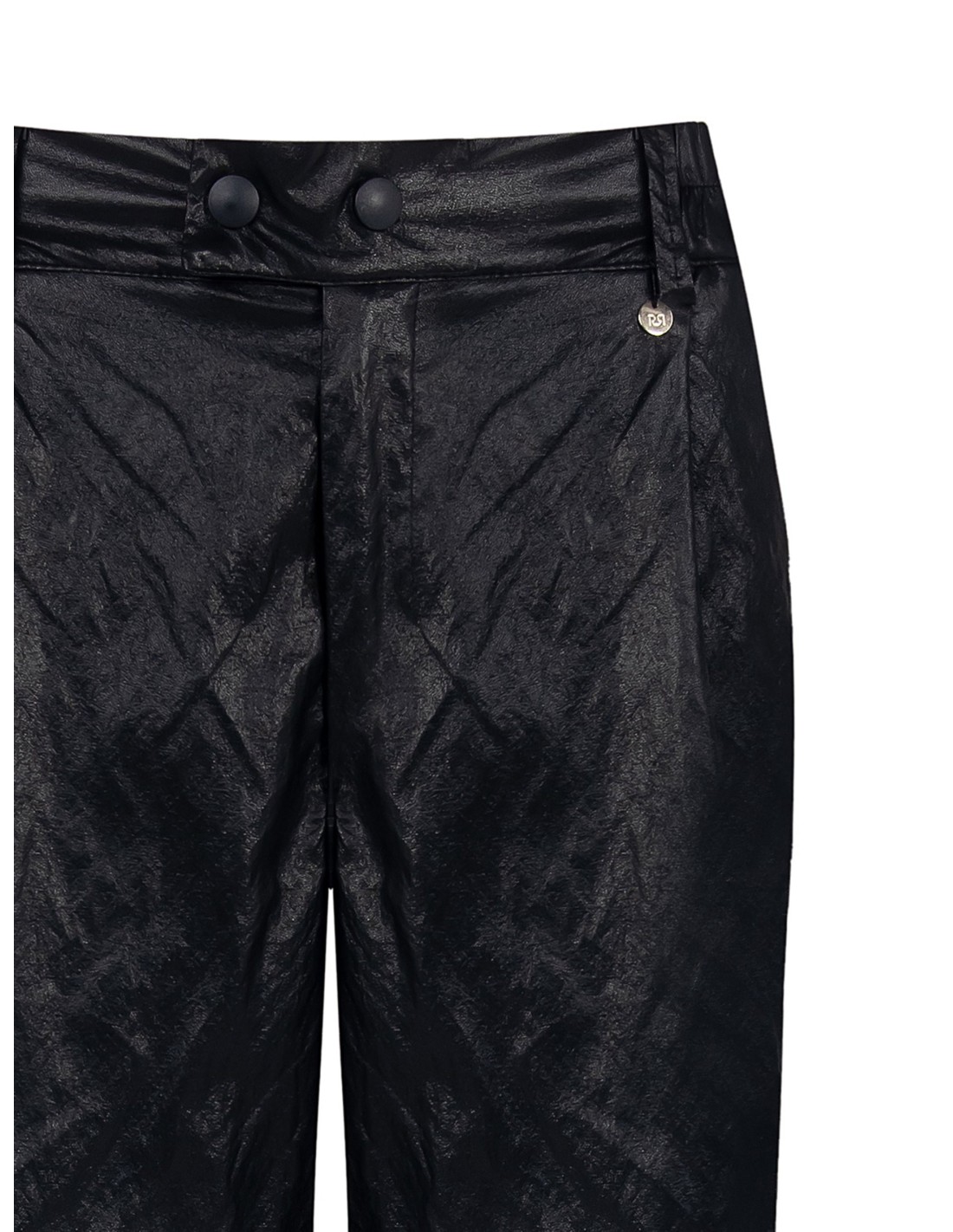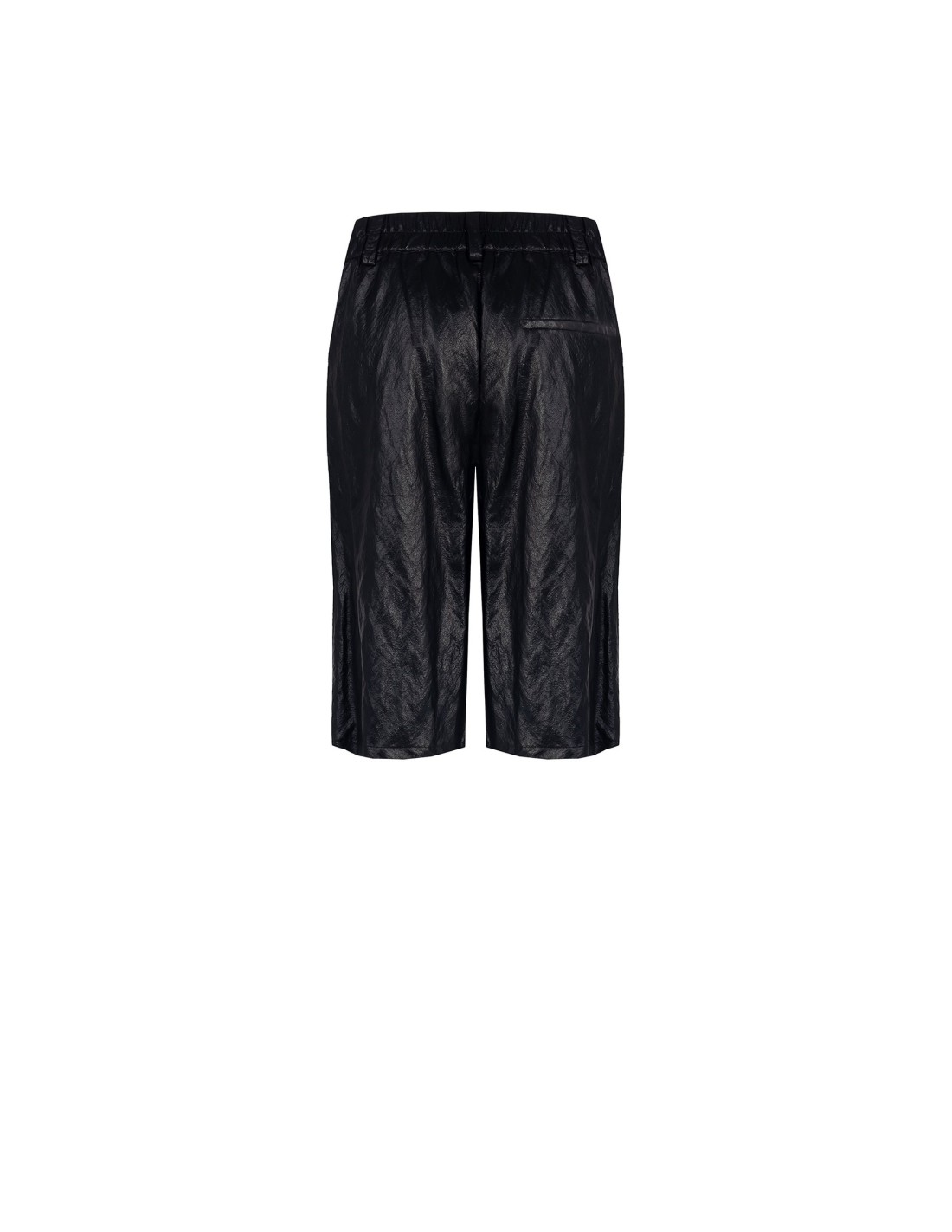 Calças até ao joelho de corte reto e fluido, pensadas para acompanhar a silhueta com conforto. A mistura de viscose com textura laminada confere luz e carácter, enquanto a cintura com botões duplos e elástico na parte traseira assegura um ajuste prático. Perfeitas do escritório ao aperitivo.
