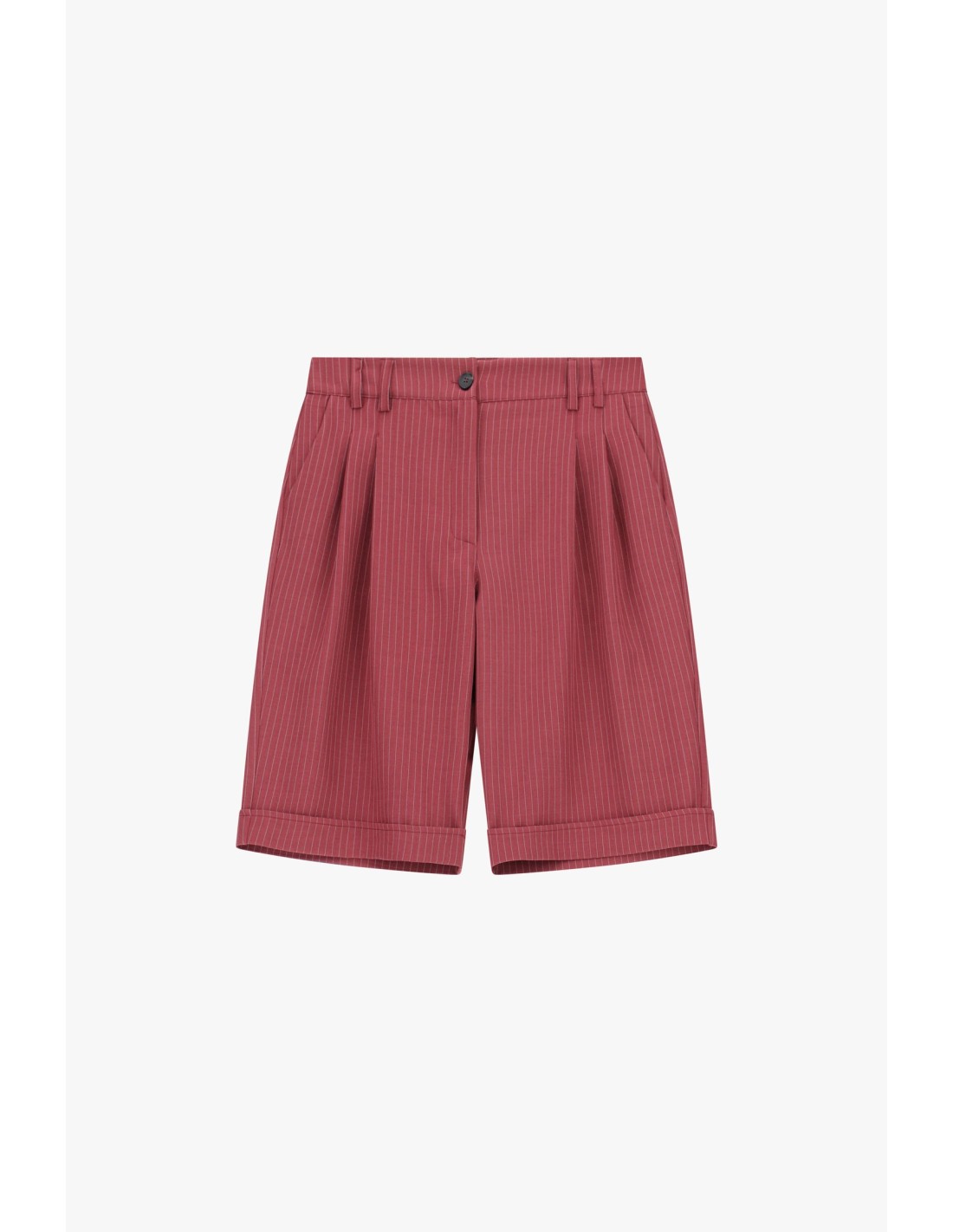 Bermuda às riscas com corte regular, cintura média e pregas frontais que acrescentam um toque elegante ao look do dia a dia. Passantes para cinto e bolsos laterais permitem alternar entre looks casuais e mais sofisticados, perfeitos para exprimir um estilo pessoal pelas ruas da cidade.