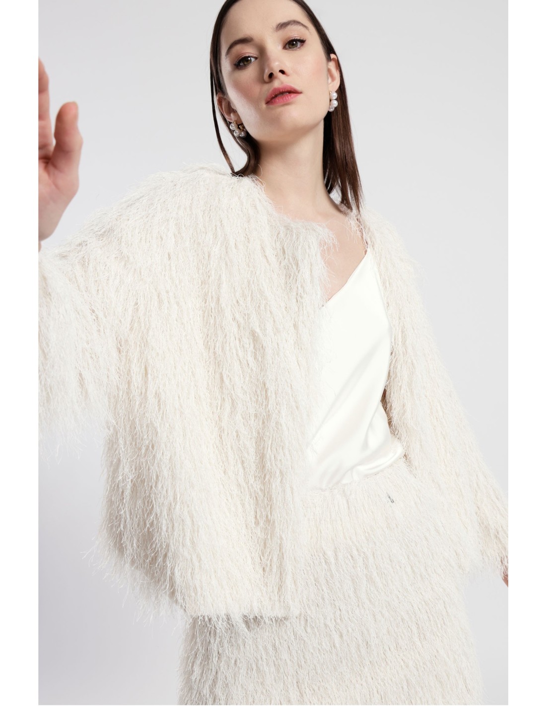 Adiciona um toque original aos teus looks quotidianos com este blazer curto de corte suave e mangas amplas. O design com efeito pelúcia cria volume e movimento, perfeito para combinar com jeans ou saias para te destacares com estilo em qualquer ocasião.