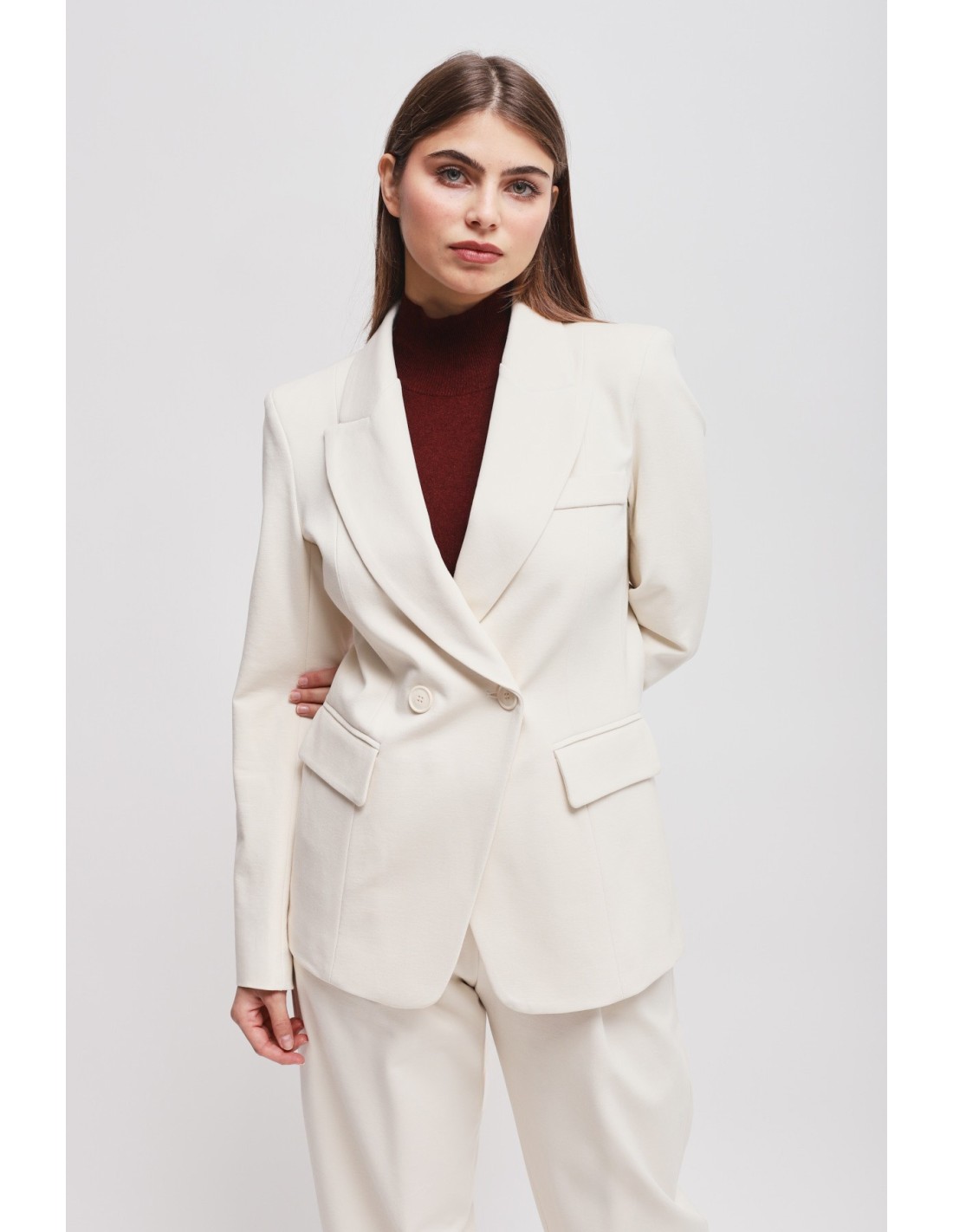 Maryley assina um casaco com corte justo mas confortável em ponto Milano, macio e estruturado para valorizar a silhueta. Lapela em bico, duplo abotoamento e bolsos com aba definem uma elegância contemporânea. Perfeito para o escritório e ocasiões formais, adapta‑se também ao look do dia com jeans ou calças fluidas.