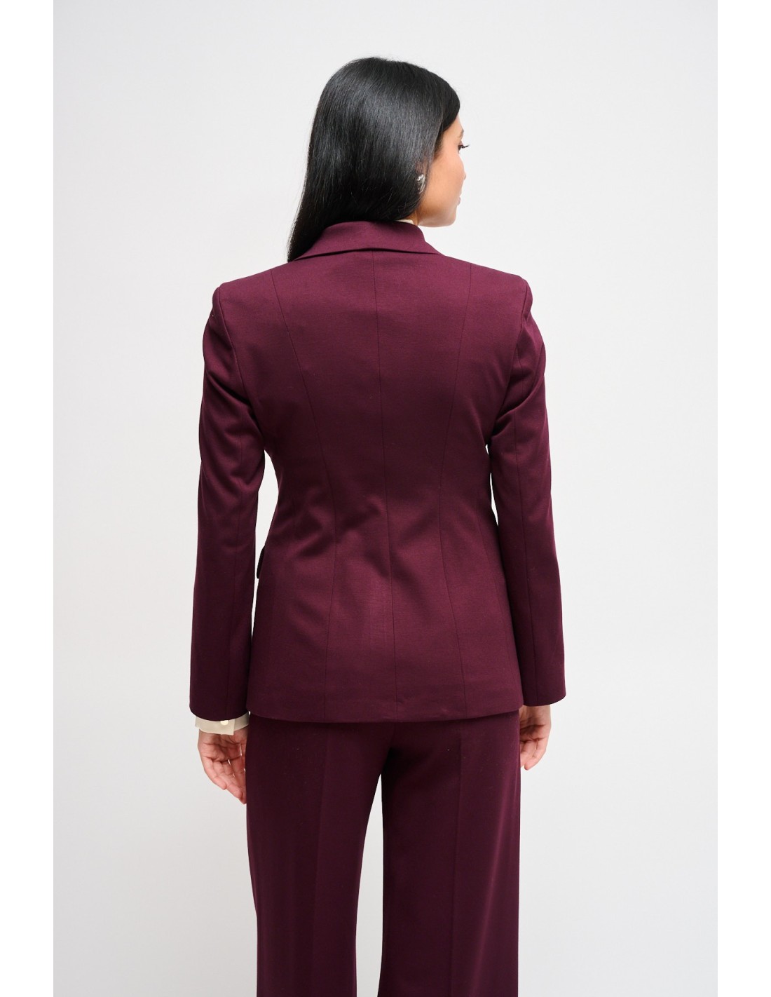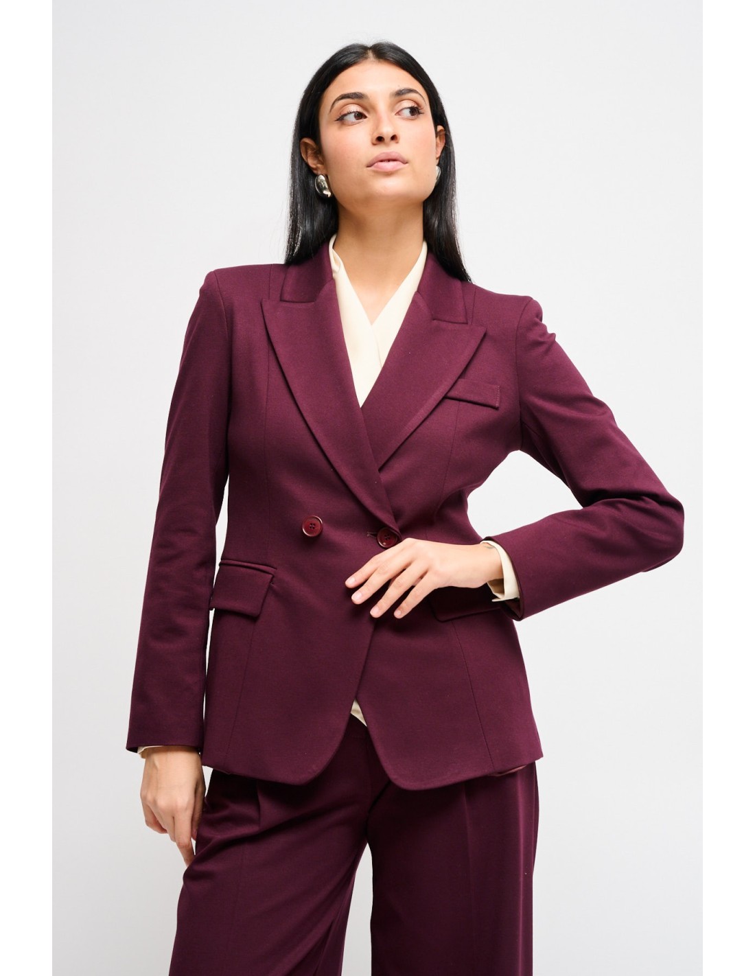 Maryley assina um casaco com corte justo mas confortável em ponto Milano, macio e estruturado para valorizar a silhueta. Lapela em bico, duplo abotoamento e bolsos com aba definem uma elegância contemporânea. Perfeito para o escritório e ocasiões formais, adapta‑se também ao look do dia com jeans ou calças fluidas.