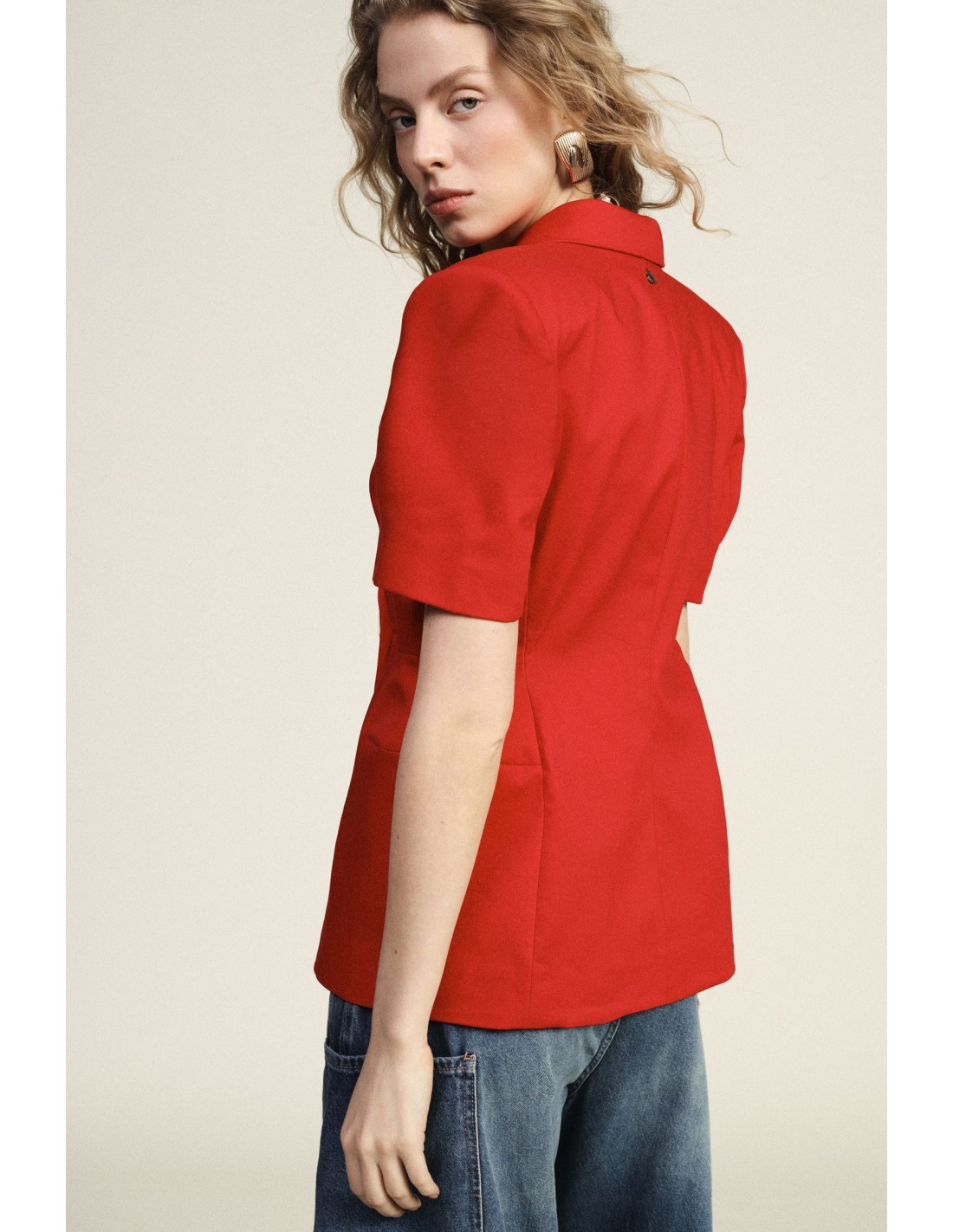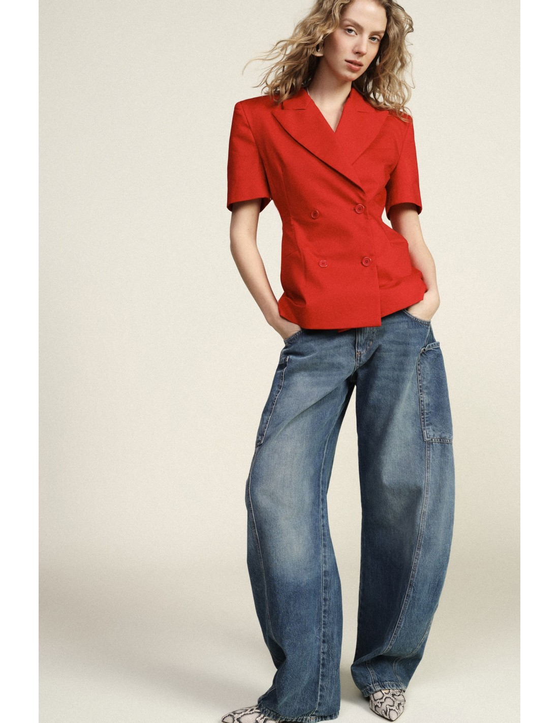 O blazer de duplo peito com mangas curtas traz frescura ao guarda‑roupa do dia a dia. Linhas estruturadas, ombros definidos e lapela combinam‑se para um look distintivo, mas fácil de coordenar. Usa‑o com os teus jeans preferidos para acrescentar personalidade e tornar cada saída especial.