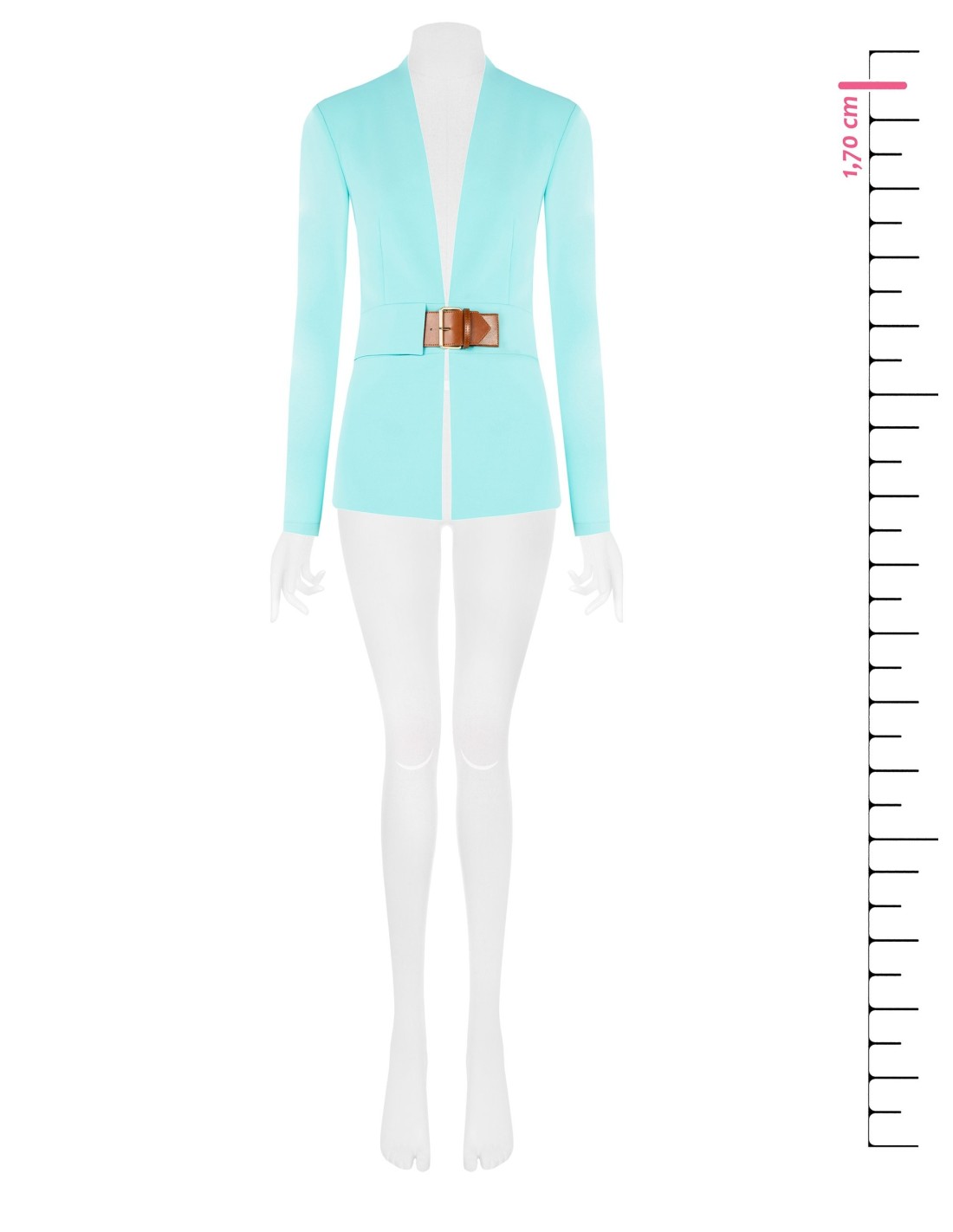 Blazer com corte justo e feminino, em scuba crepe de toque compacto e confortável, perfeito para valorizar a silhueta. O decote sem lapelas e o cinto com efeito pele e fivela marcam a cintura com carácter. Ideal para o escritório e para um afterwork cuidado.