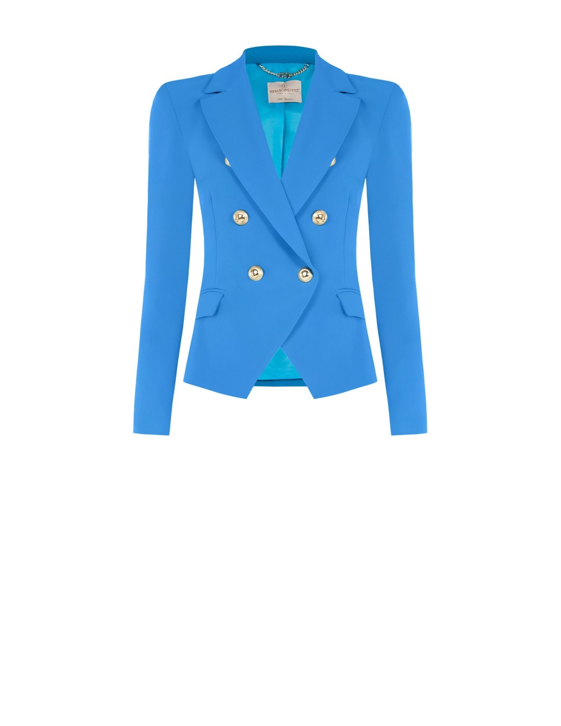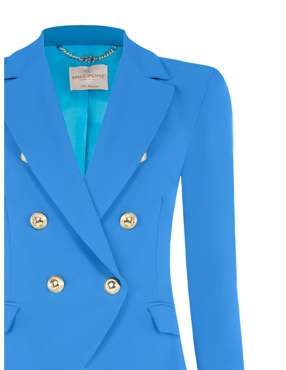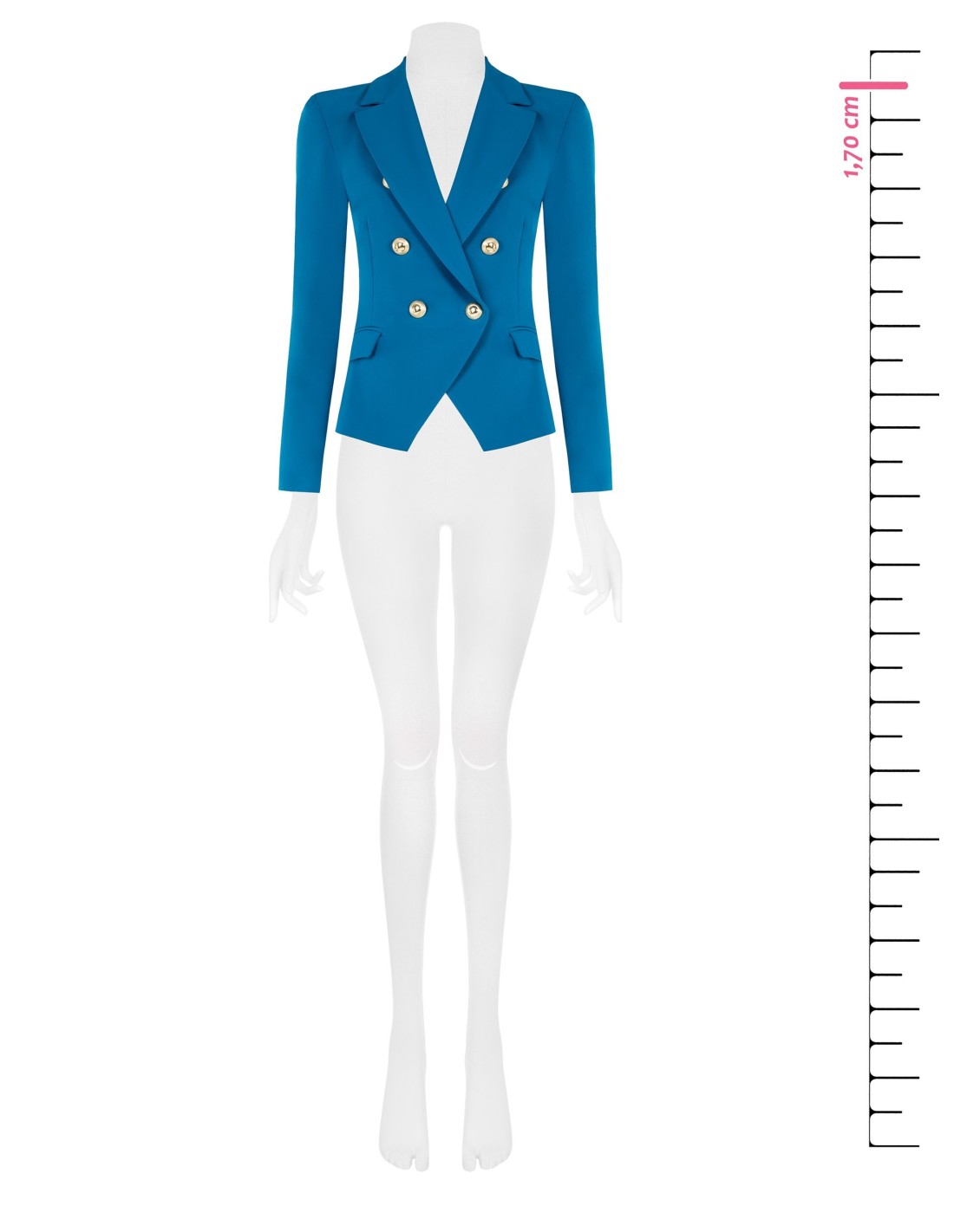 Blazer Rinascimento com corte acinturado que valoriza a silhueta. Confeccionado em tecido técnico ligeiramente elástico, acompanha os movimentos com conforto. Abotoamento duplo com botões metálicos, lapelas afiadas e bolsos embutidos. Perfeito para o escritório e para os after‑work, combina com calças ou denim para um look decidido e feminino.