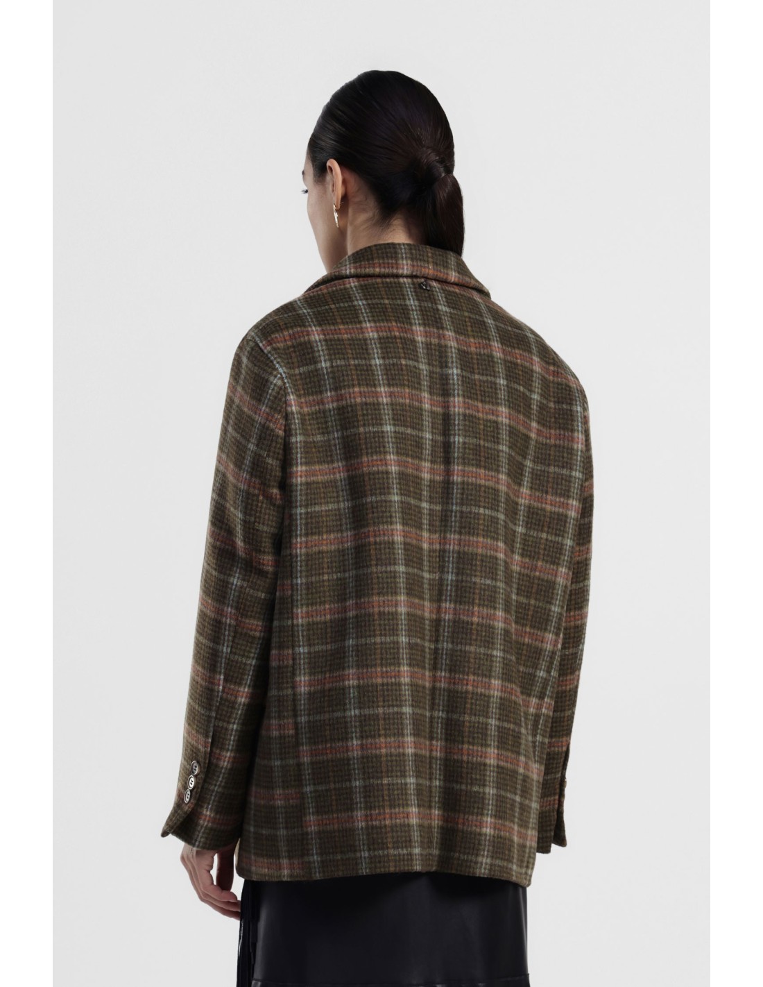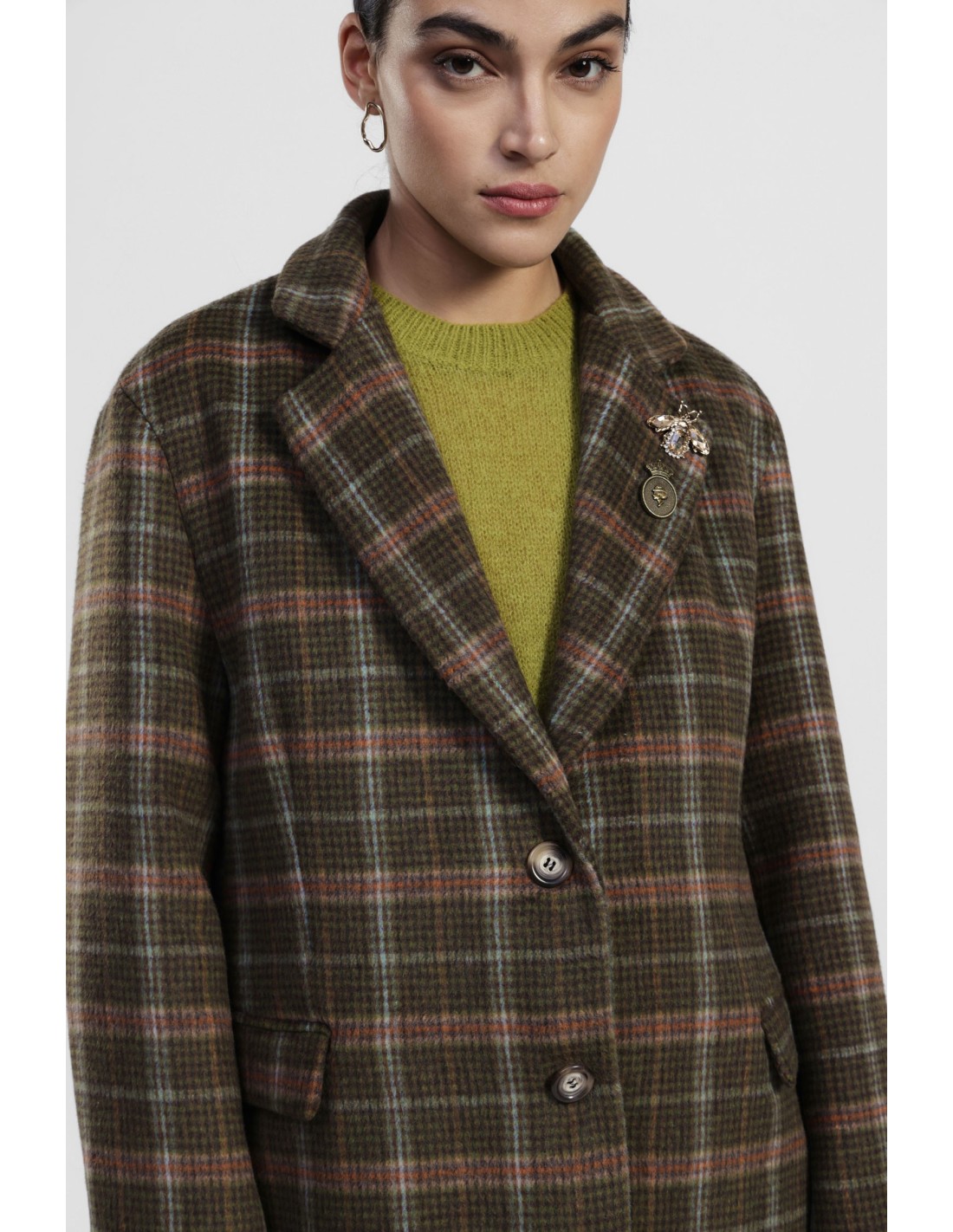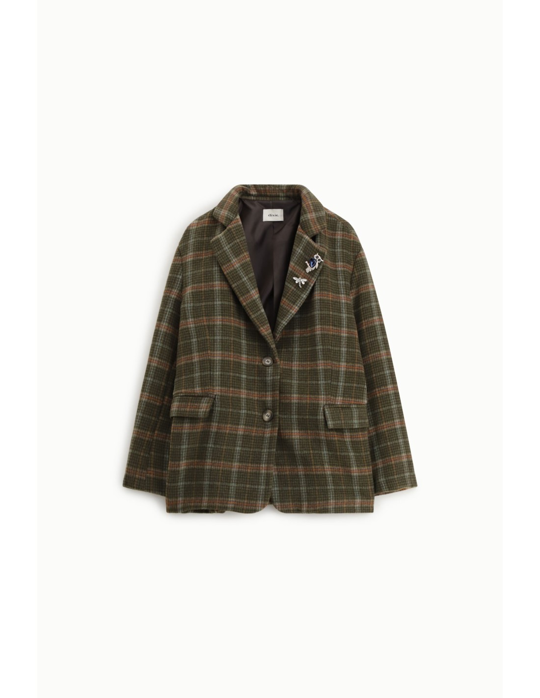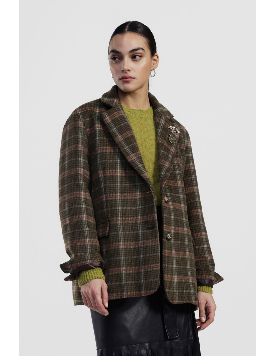 Este blazer xadrez conquista pelos seus detalhes pensados: bolsos com aba, botões nas mangas e broches decorativos na lapela. Perfeito para acrescentar estilo aos looks do dia a dia, adapta‑se facilmente tanto a jeans como a calças mais formais. Um blazer que une originalidade e feminilidade em todas as ocasiões.