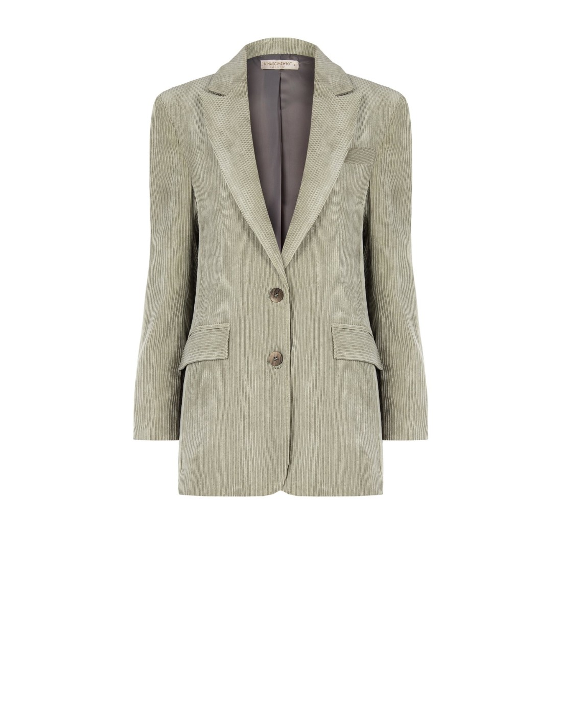 Rinascimento assina um blazer de corte macio e masculino, que esculpe a silhueta sem apertá‑la. Em veludo cotelê soft-touch, forrado para conforto quotidiano. Revers em bico e fecho de dois botões, bolsos com aba. Perfeito no escritório com calças coordenadas ou para um look diário elegante com denim e botins.