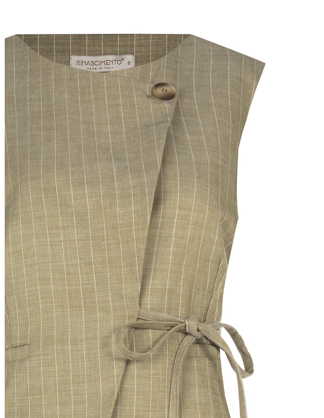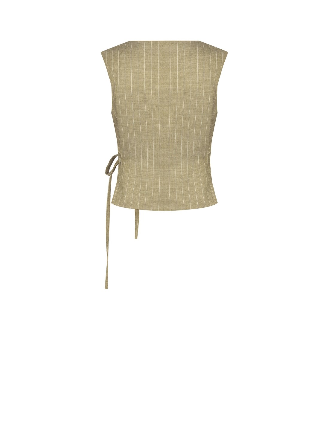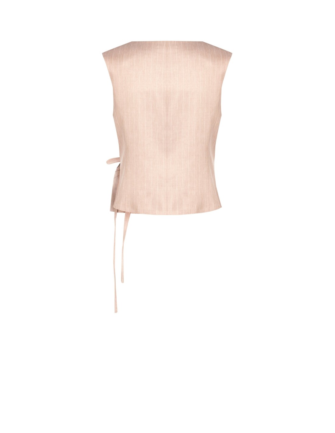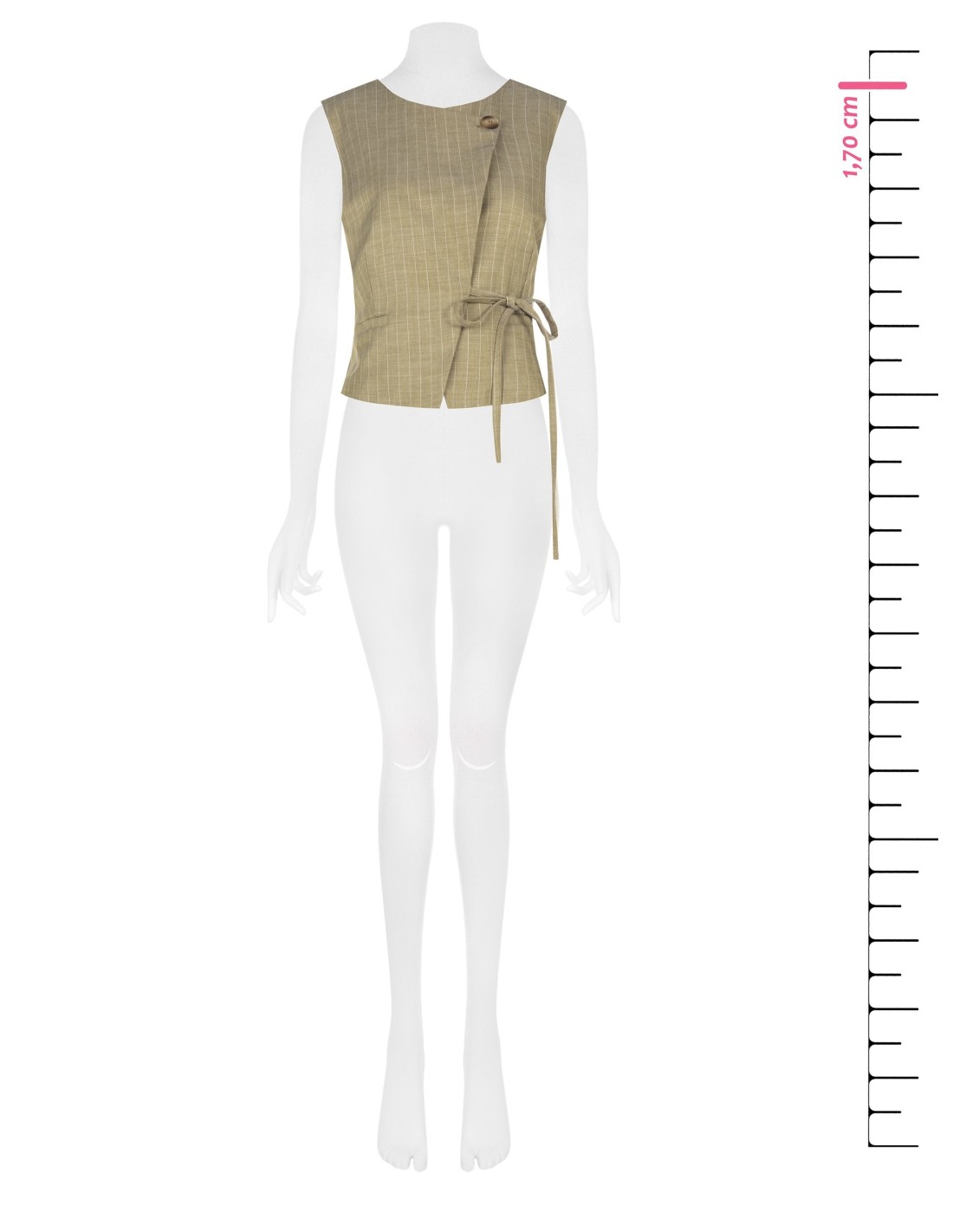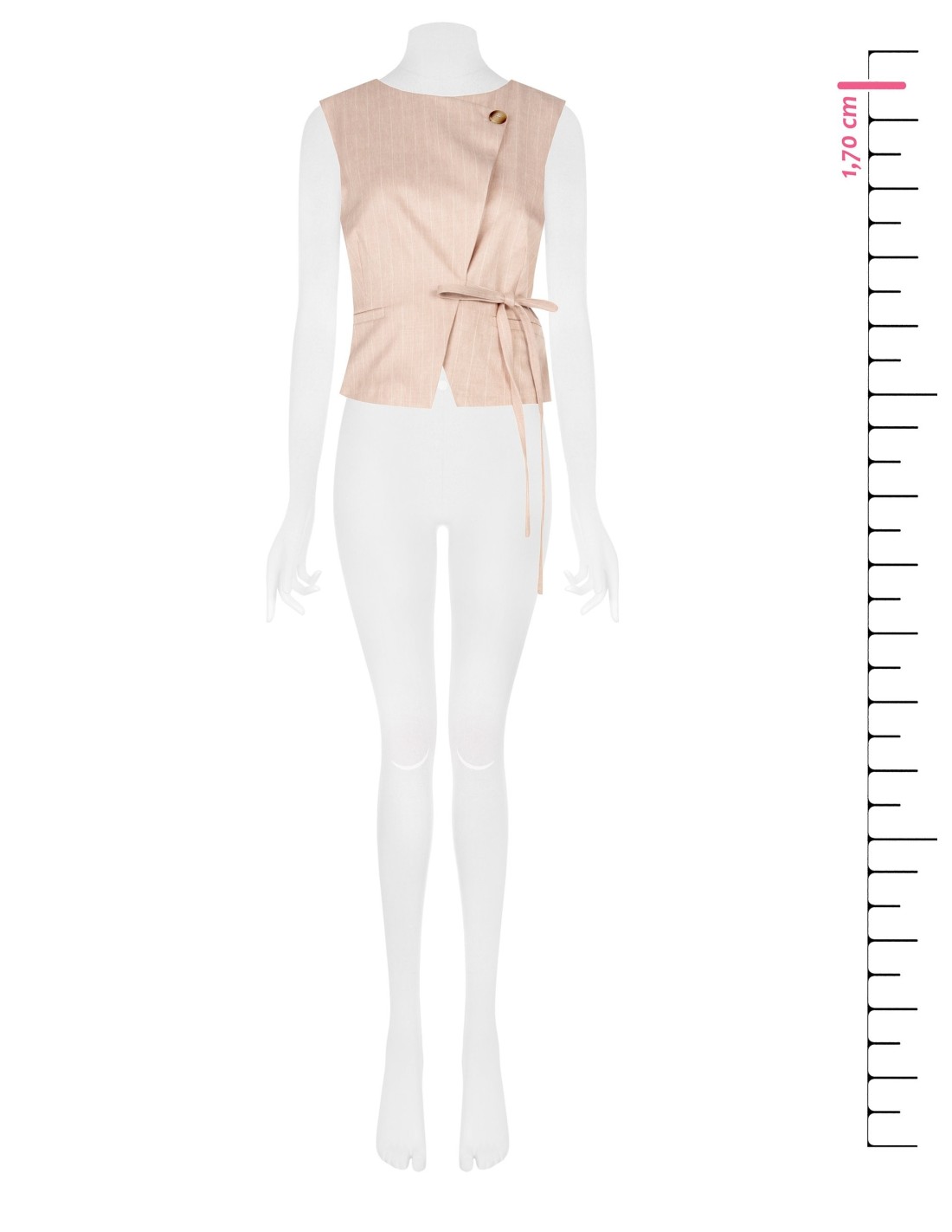 Colete de corte justo e feminino, em tecido leve com efeito linho e refinada trama às riscas finas. O decote suave e o fecho lateral com tiras e botão definem a cintura com conforto. Perfeito no escritório, para o dia a dia cuidado ou um aperitivo chique.