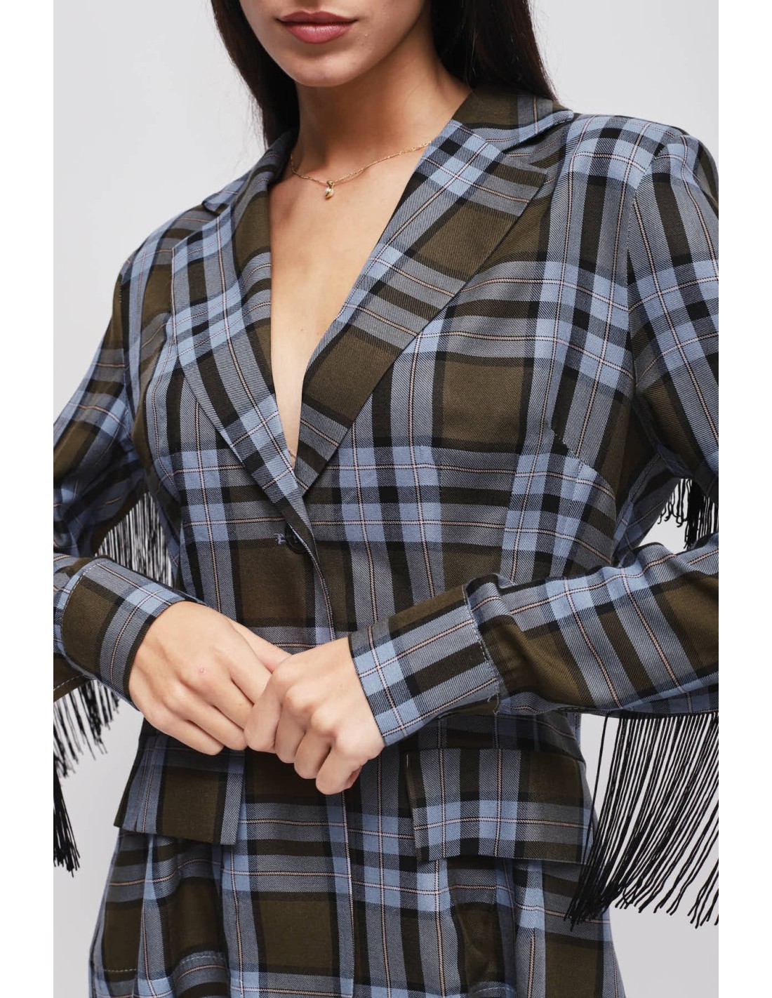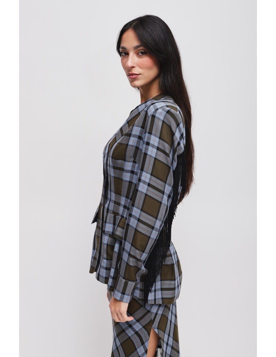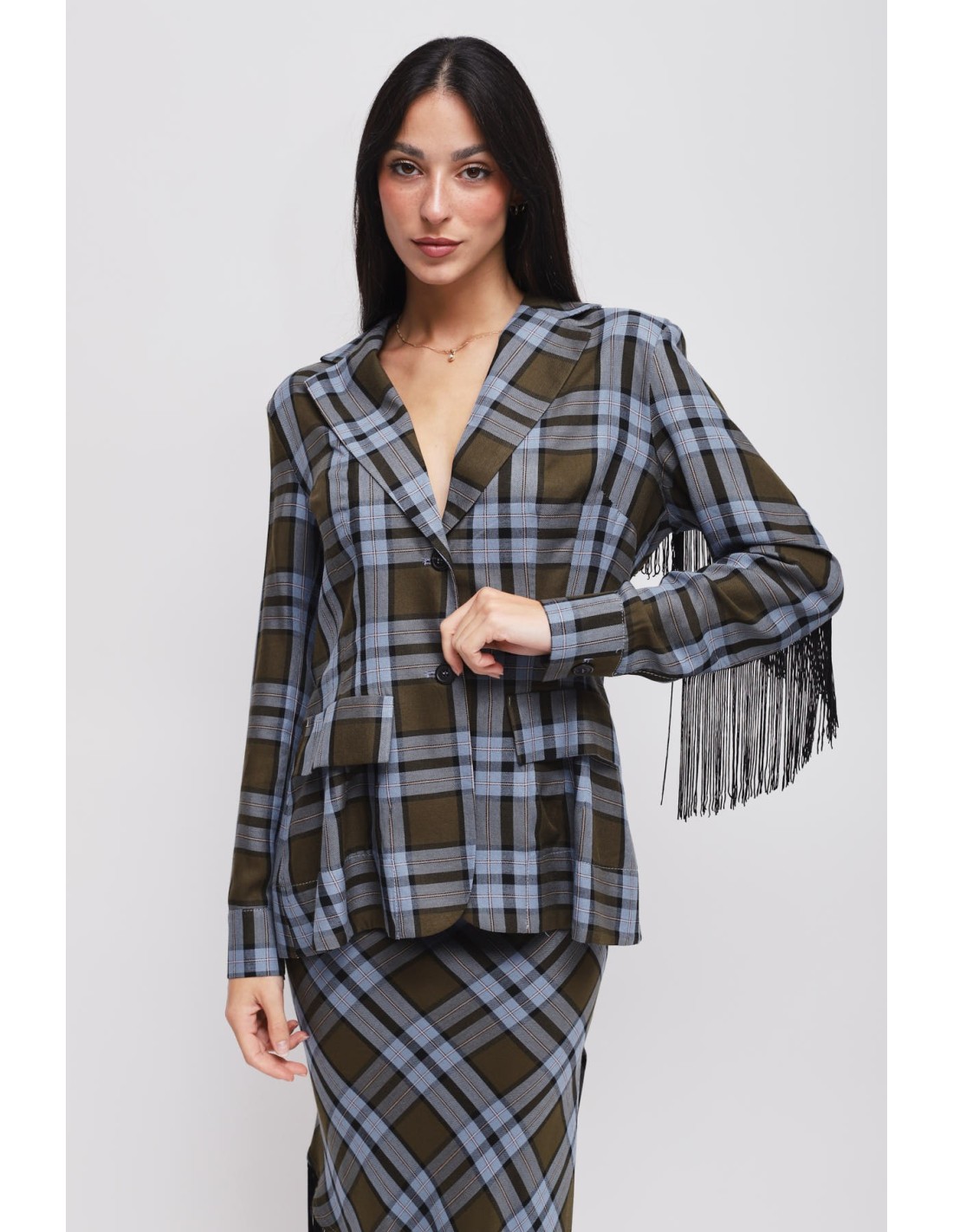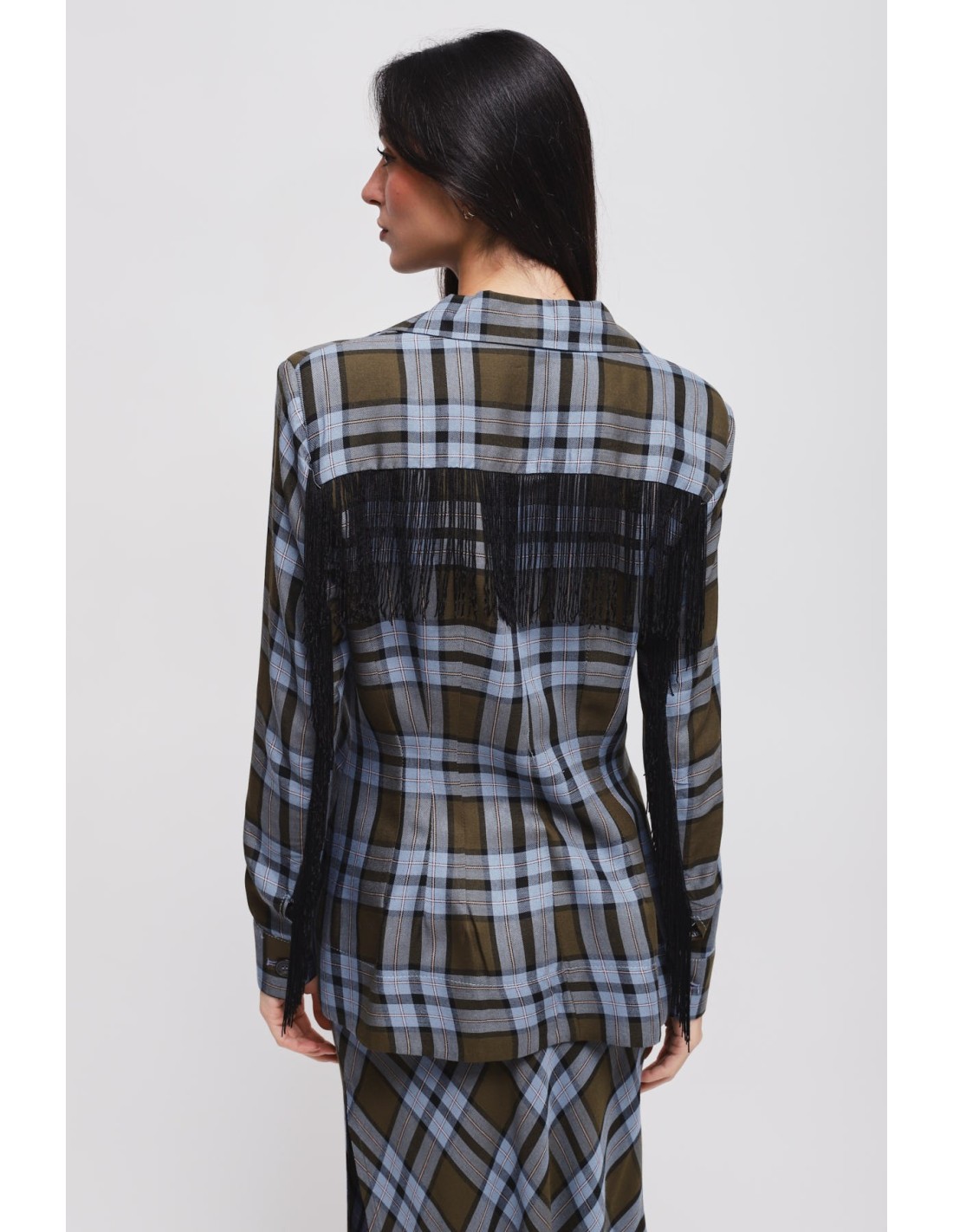 Blazer Maryley xadrez, corte feminino que acentua a cintura sem apertar. Tecido macio e consistente, agradável na pele. Revers em bico e franjas aplicadas na parte de trás e ao longo das mangas para um movimento que capta o olhar. Fecho de dois botões e bolsos com aba. Perfeito para escritório smart ou aperitivos.