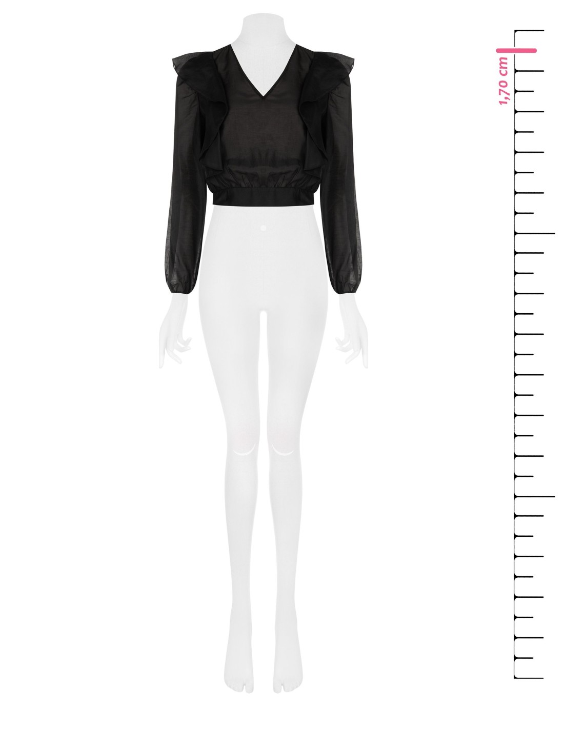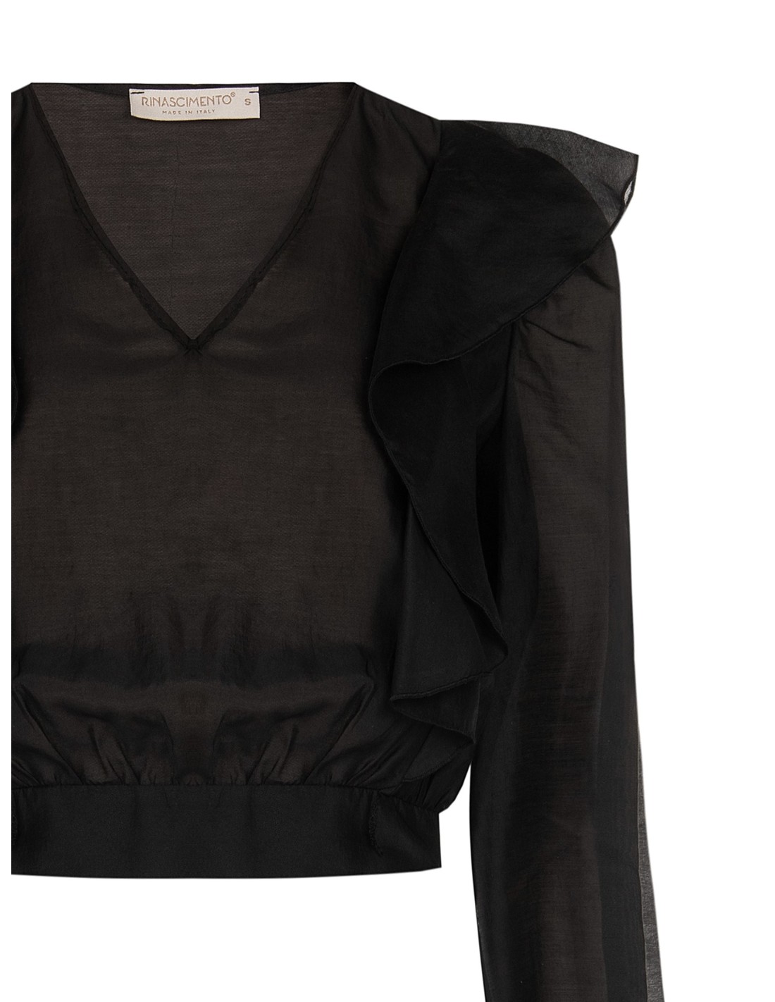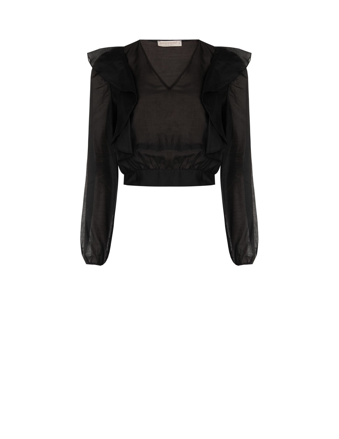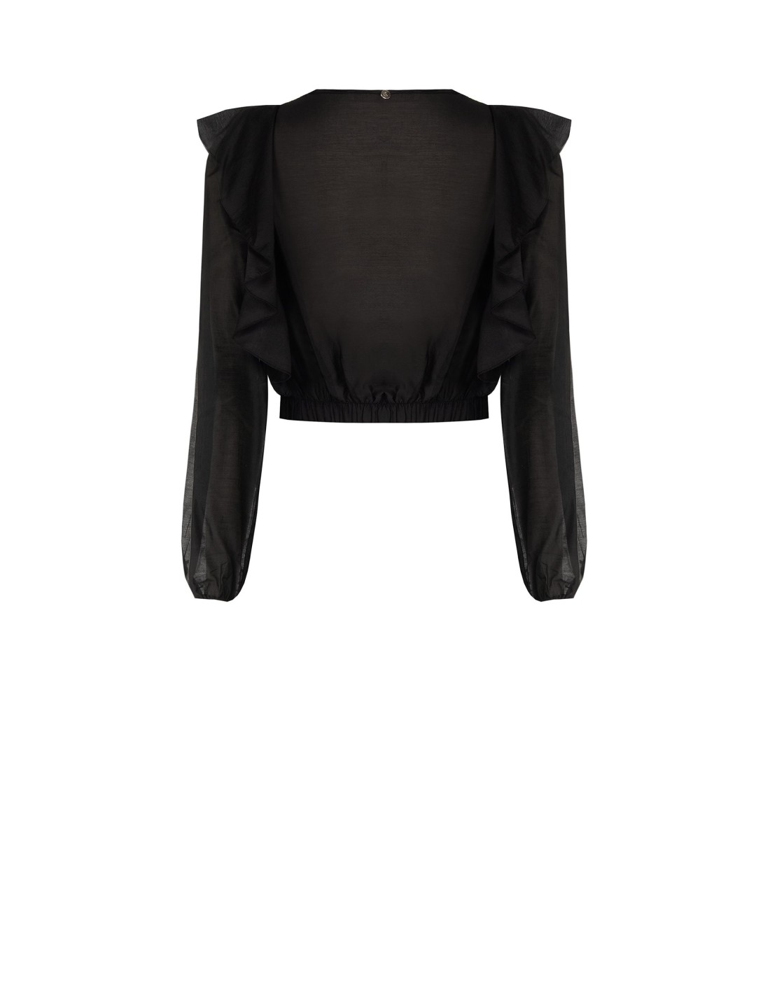 Top leve de corte suave com cintura elástica que define a silhueta sem renunciar ao conforto. Em tecido fluido e semitransparente, destaca-se pelo decote em V e pelos amplos folhos nos ombros. Perfeito do escritório ao aperitivo, com estilo e versatilidade.