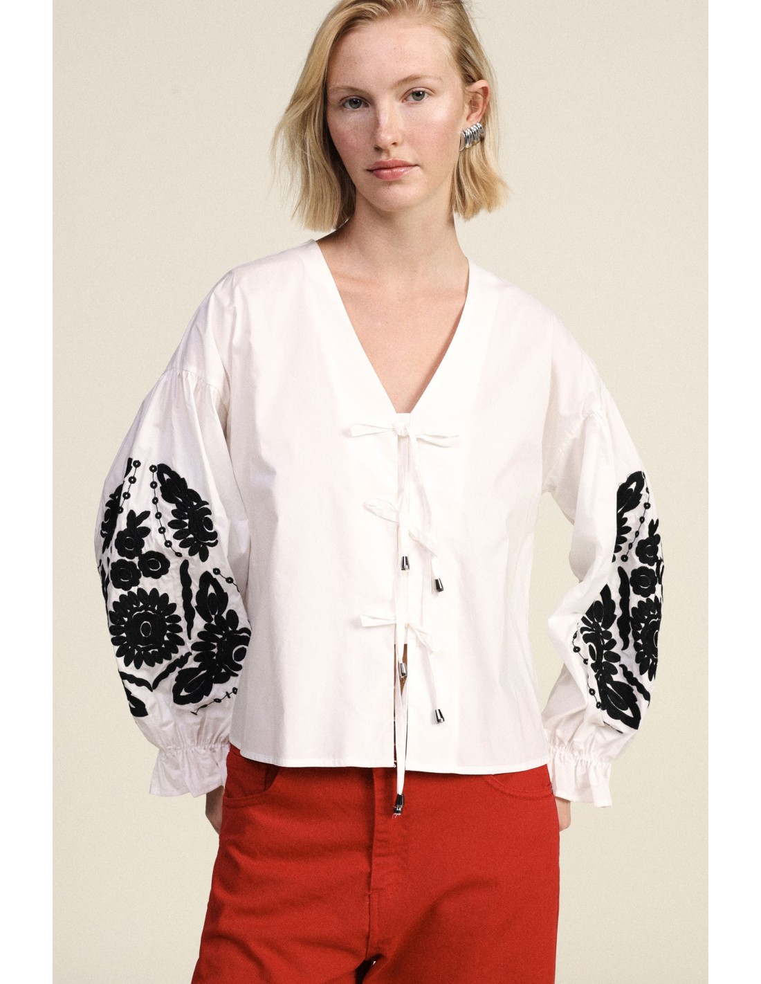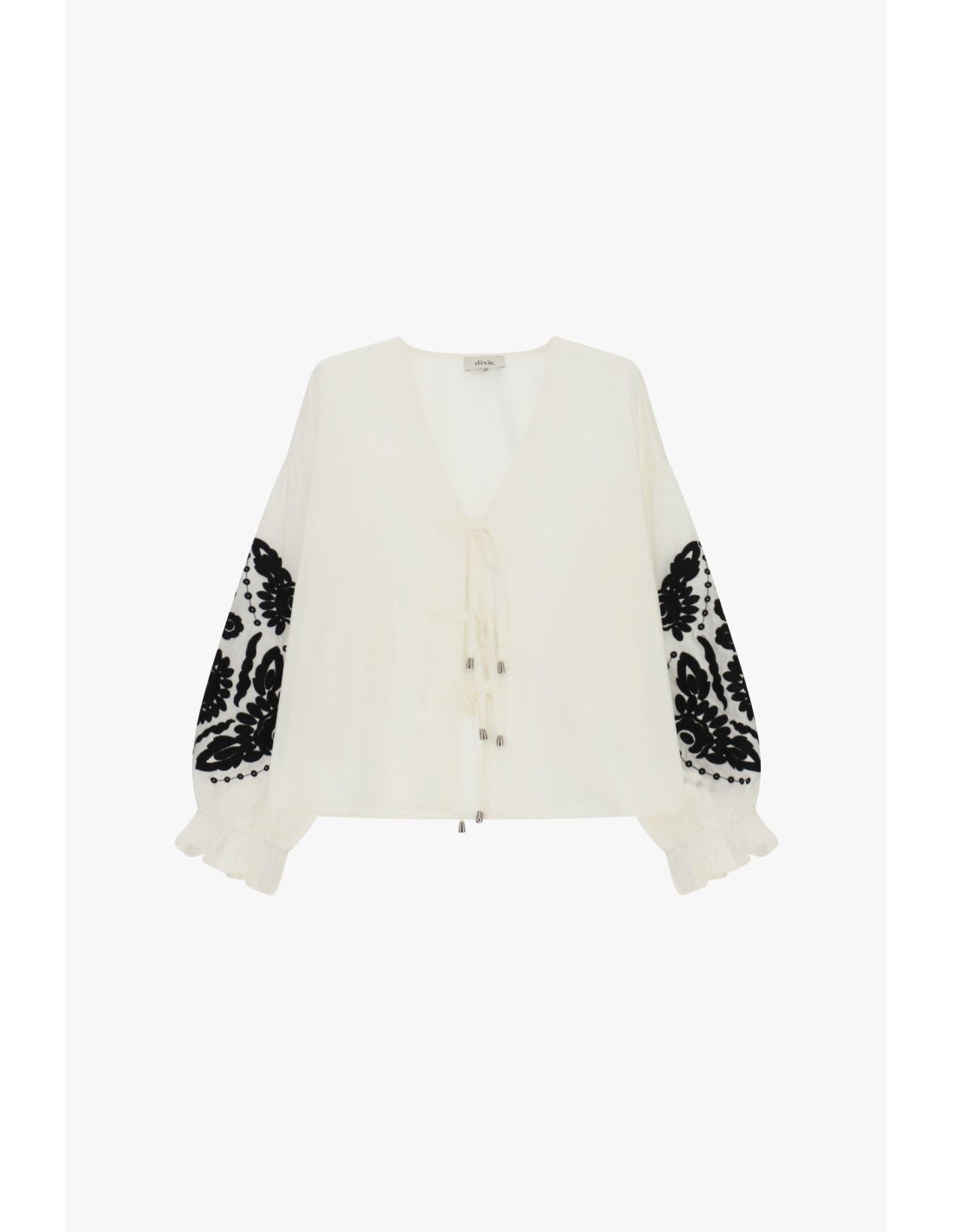 Esta blusa de corte solto destaca-se pelas mangas largas decoradas com bordados florais em contraste e detalhes franzidos nos punhos. Os cordões à frente acrescentam um toque divertido e prático, ideal para completar looks casuais ou boho-chic em dias amenos.