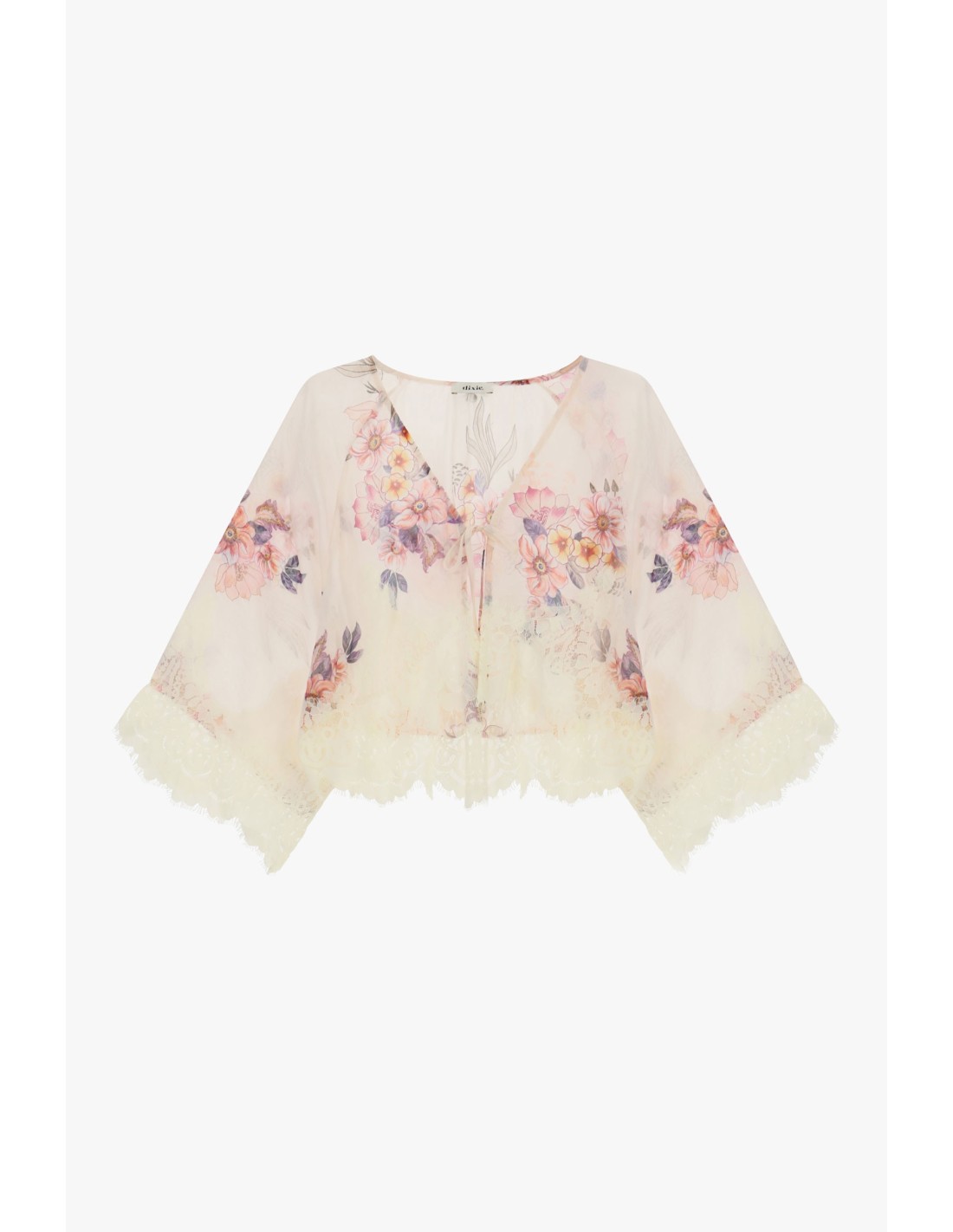 Esta blusa leve e ampla apresenta uma estampa floral delicada e uma bainha em renda que confere um toque romântico. As mangas largas e o fecho frontal discreto tornam-na ideal para criar looks frescos e cheios de personalidade. Perfeita para sentir-se feminina e original todos os dias.