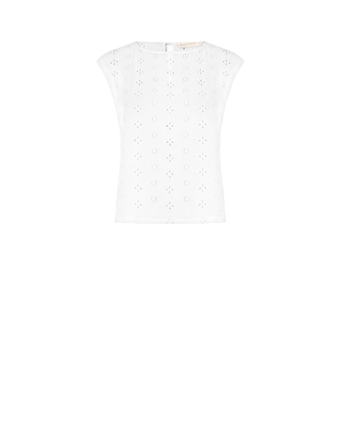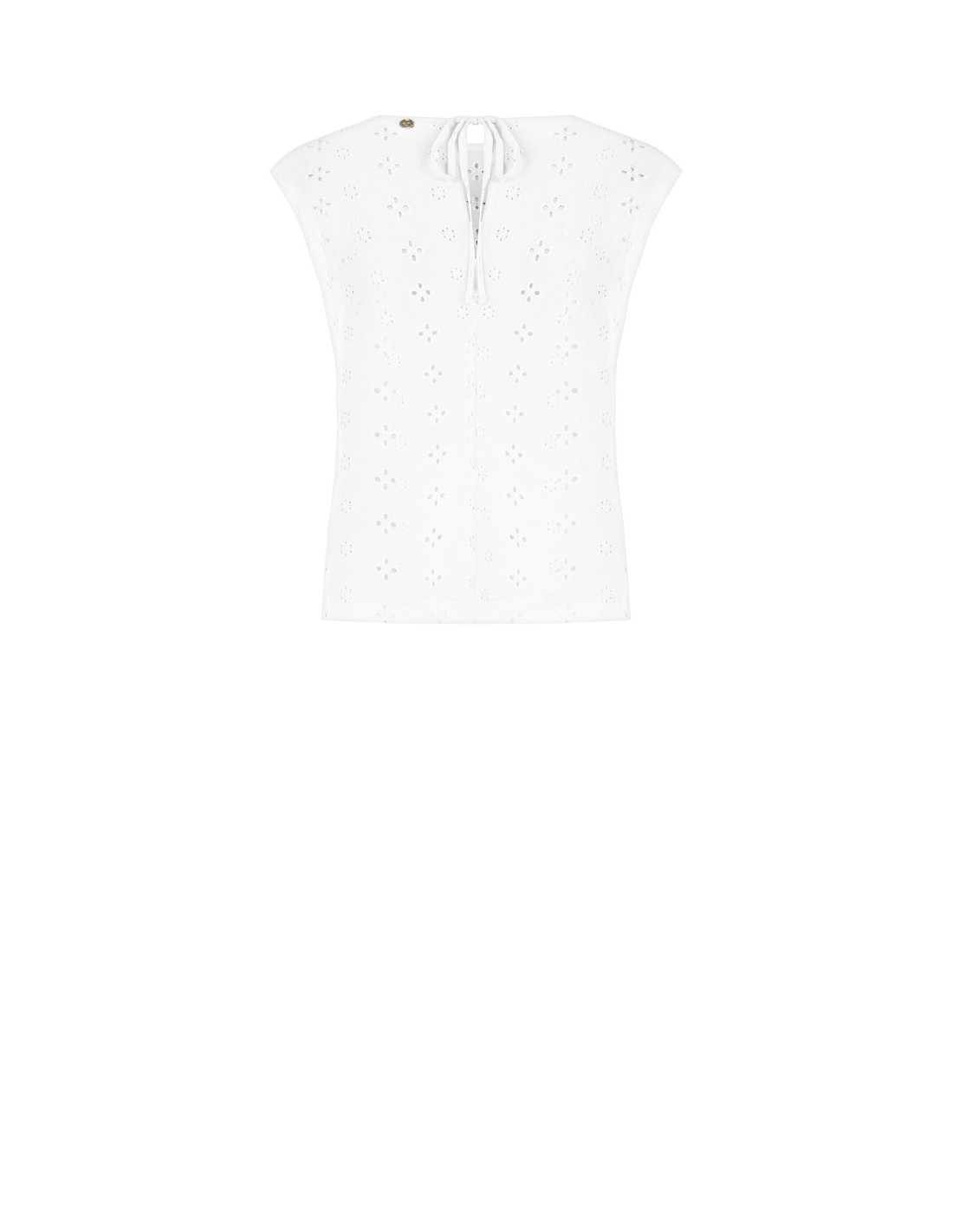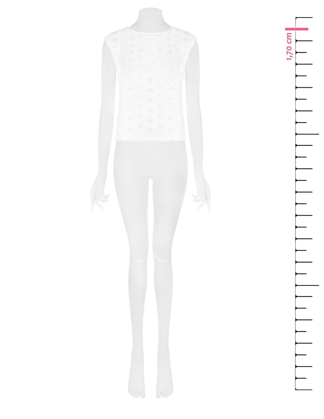 Top de corte suave, leve na pele e concebido para acompanhar a silhueta com naturalidade. Em georgette transparente com bordado floral por toda a peça, tem decote redondo e fecho em gota com cordão nas costas. Perfeito do escritório ao aperitivo, com elegância versátil.