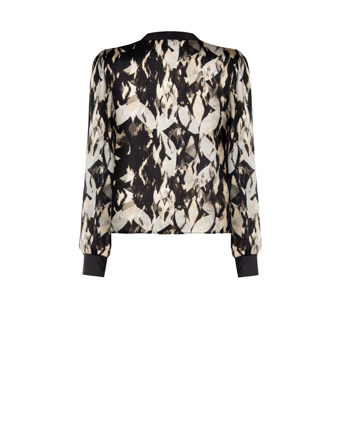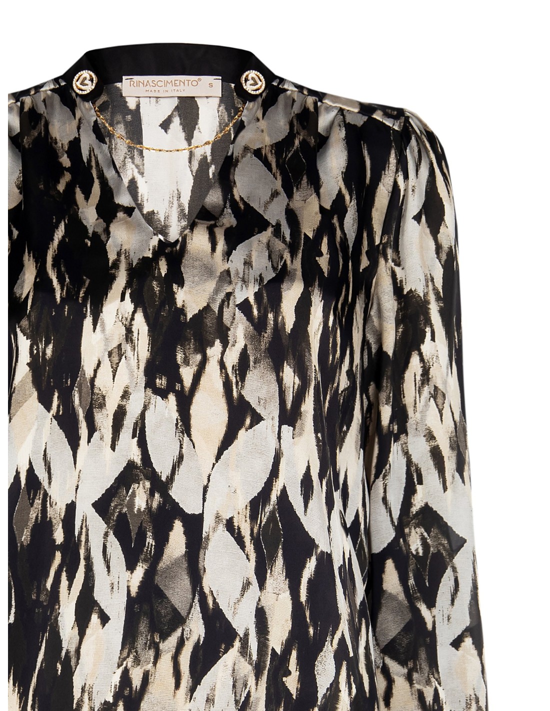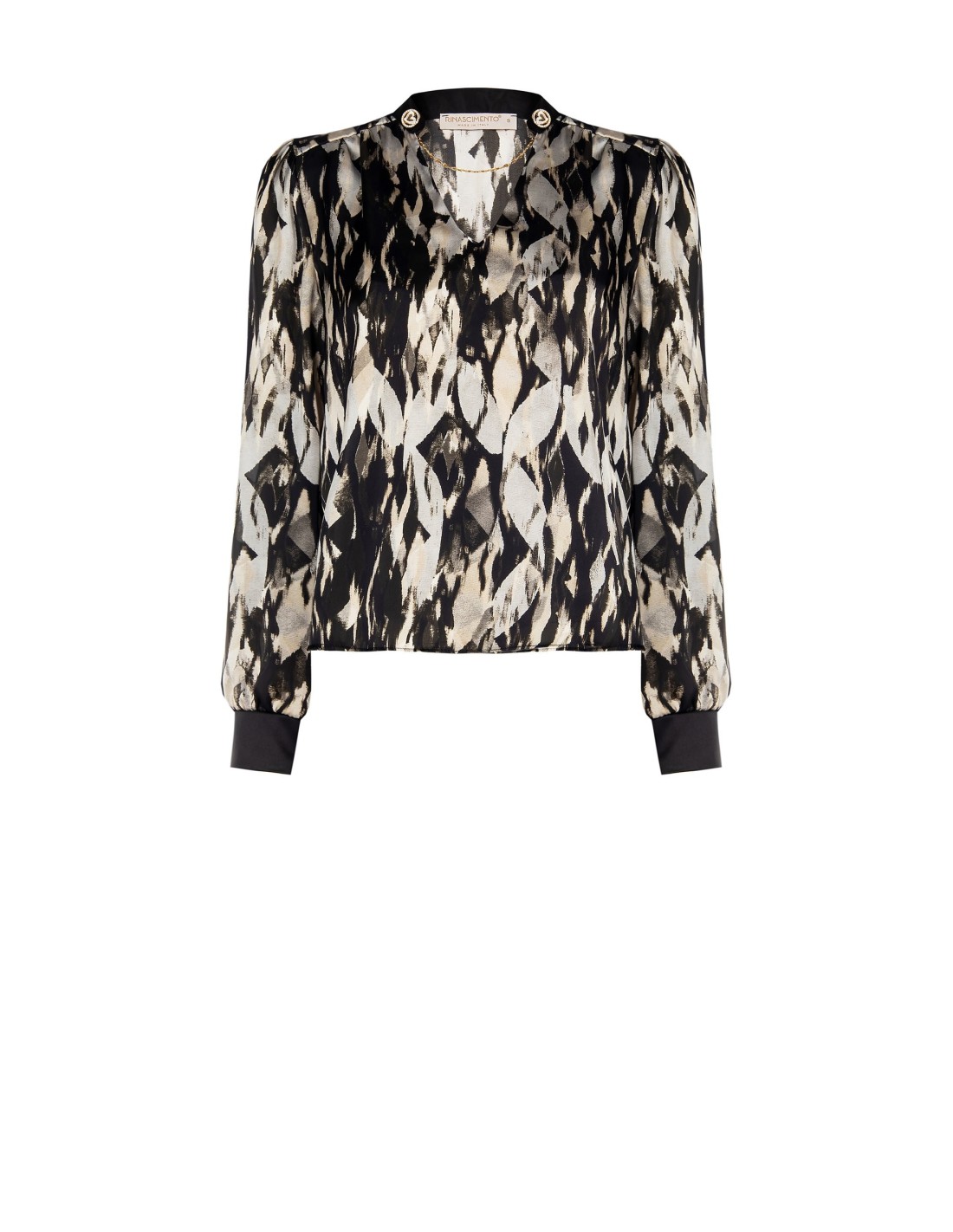 Top fluido em cetim com linha suave que acaricia a silhueta sem marcar. O motivo abstracto encontra o decote em V, botões tipo joia e corrente removível para modular o estilo. Perfeito com calças tailoring para o escritório e logo após o aperitivo.