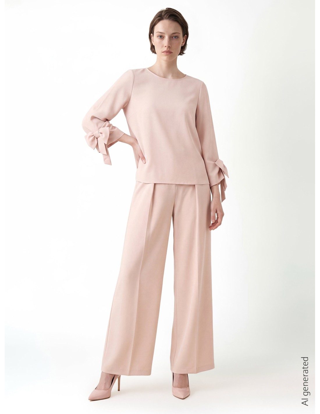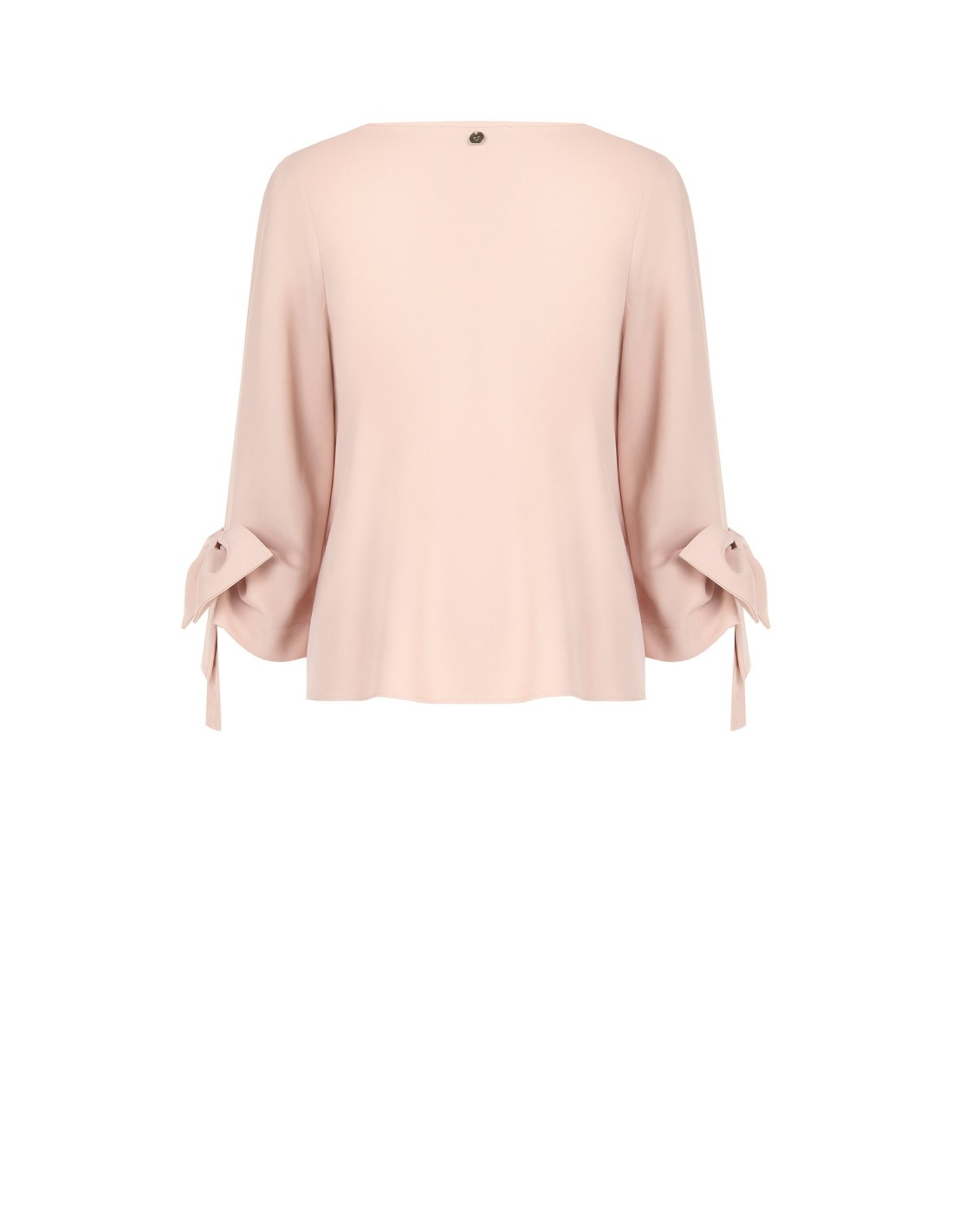 Top amplo em tecido fluido que roça a silhueta sem marcar. As mangas três quartos com maxi laços e decote redondo limpo conferem uma elegância discreta. Perfeito com calças de alfaiataria para o escritório ou com denim e saltos para um look chique do dia a dia.