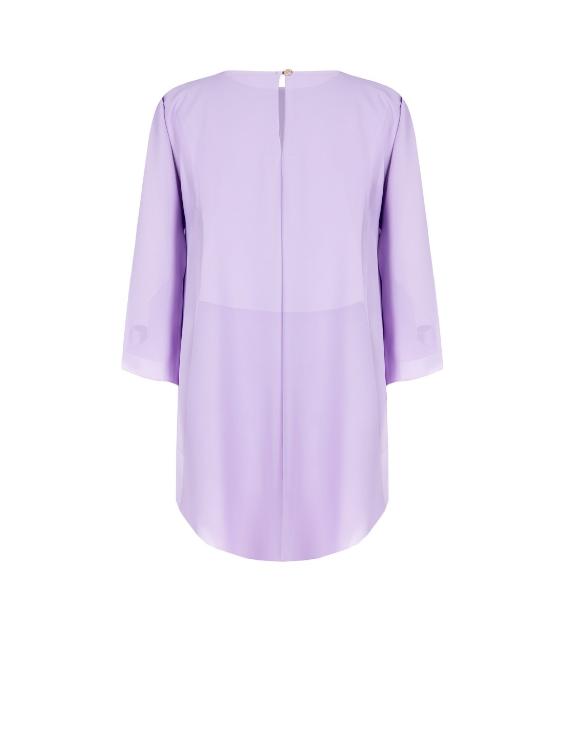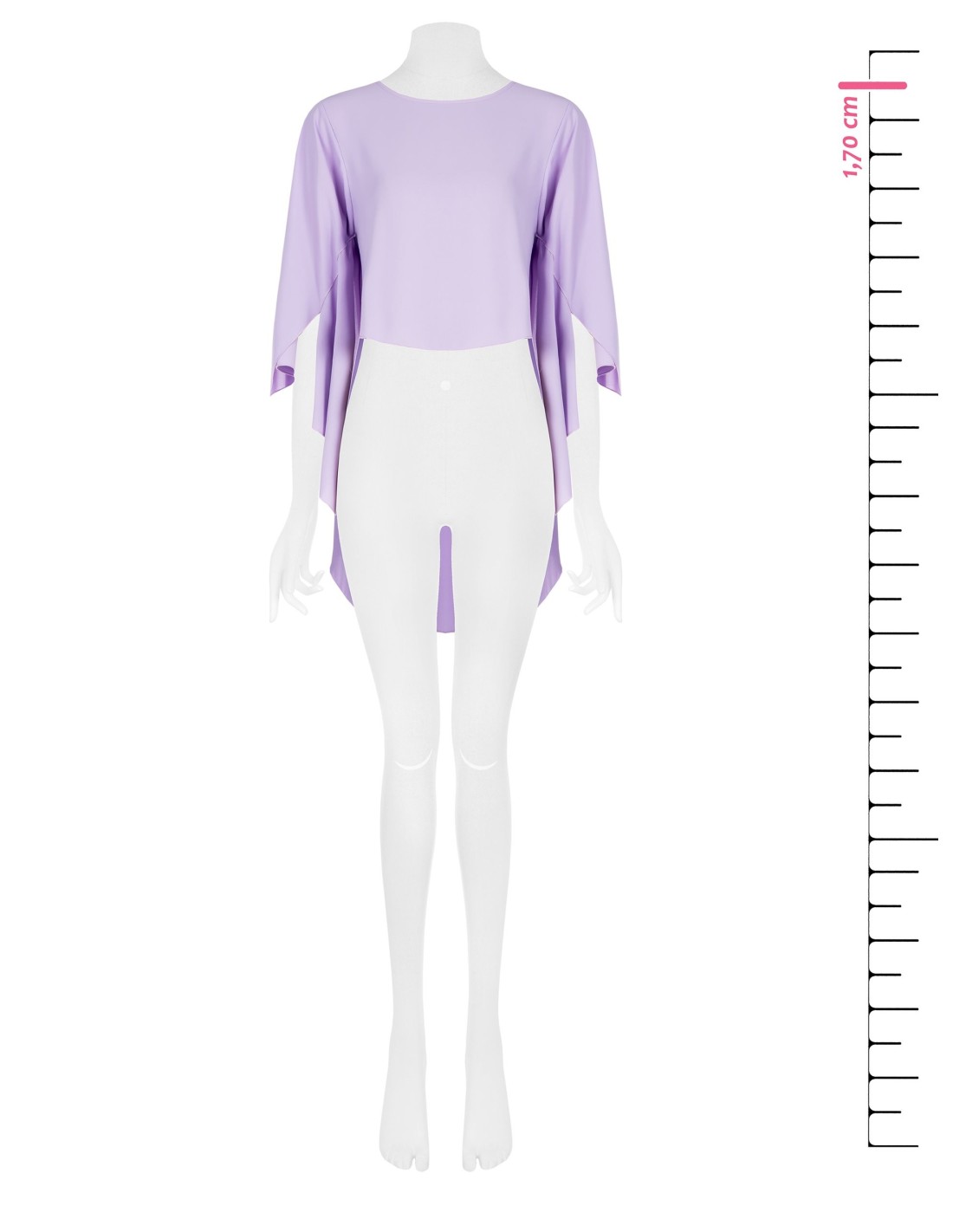 Top de linha fluida e com caimento suave, em cetim liso e luminoso que desliza sobre o corpo com conforto. O decote redondo e as mangas com efeito capa conferem movimento, enquanto o corte assimétrico afina a silhueta. Perfeito para o escritório, um evento ou um jantar especial.