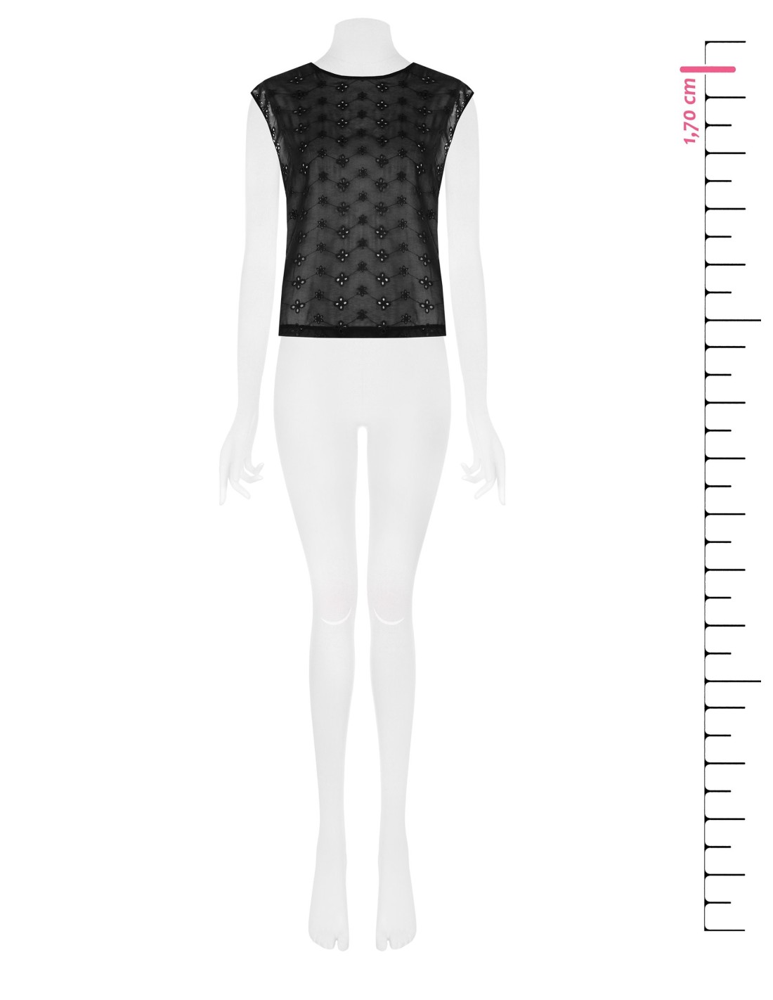 Top de corte suave, leve na pele e pensado para acompanhar a silhueta com naturalidade. Em georgette transparente com bordado floral por toda a peça, tem decote redondo e fecho em gota com fita nas costas. Perfeito do escritório ao aperitivo, com elegância versátil.