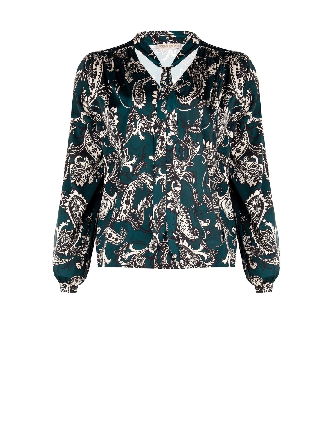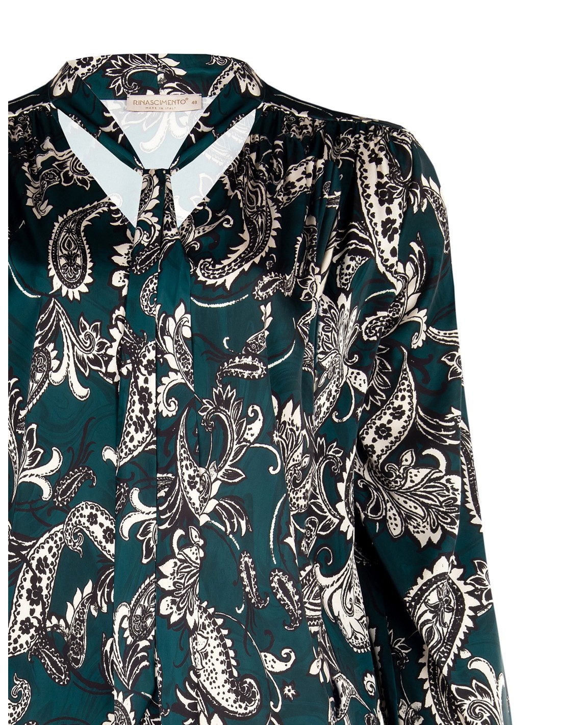 Rinascimento Curvy apresenta uma blusa com corte solto e fluido que acaricia a silhueta. Cetim leve e textura com estampado paisley para um toque refinado. Laço removível com pequeno recorte e mangas com punho. Perfeita do escritório ao aperitivo, fácil de combinar com calças e saias.