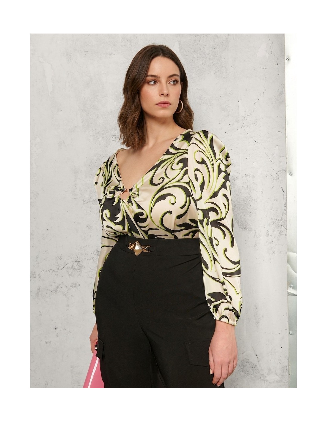Blusa Curvy acinturada em cetim estampado com anel de metal no decote Rinascimento Curvy