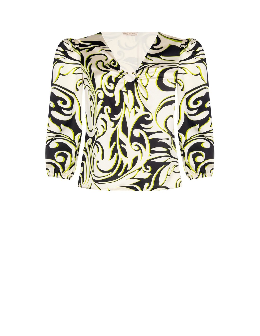 Top fluido de linha acinturada, em cetim estampado de toque macio e luminoso, concebido para acompanhar a silhueta com conforto. O decote profundo com anel metálico e as mangas ligeiramente volumosas com punhos elásticos tornam‑no ideal do escritório ao aperitivo.