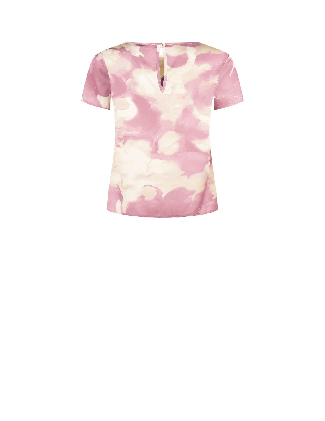 Blusa larga e fluida de cetim com flores sombreadas e manga curta