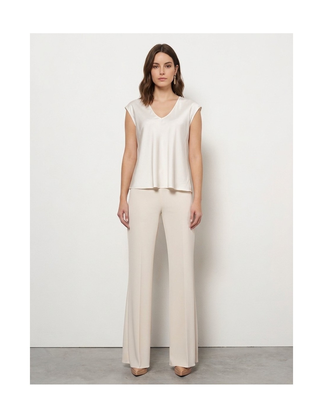 Top de corte acinturado e fluido, em cetim liso e leve que acaricia a silhueta com conforto. O decote em V e as mangas com aba conferem feminilidade e elegância, perfeito do escritório ao aperitivo com apenas um gesto de estilo.
