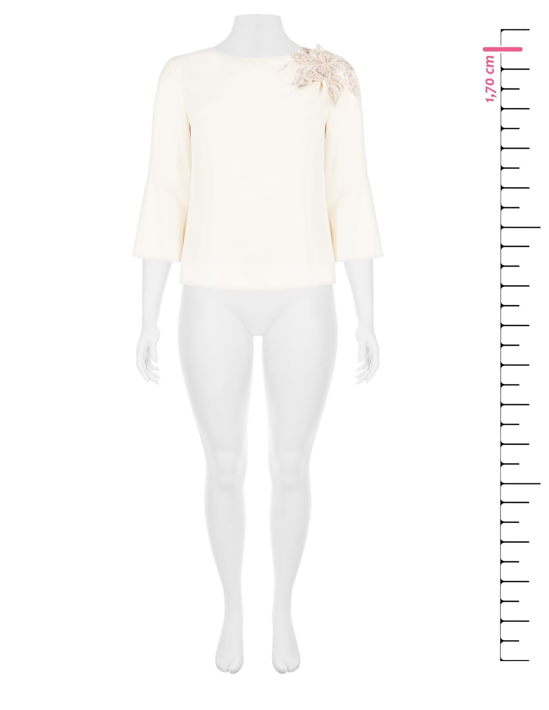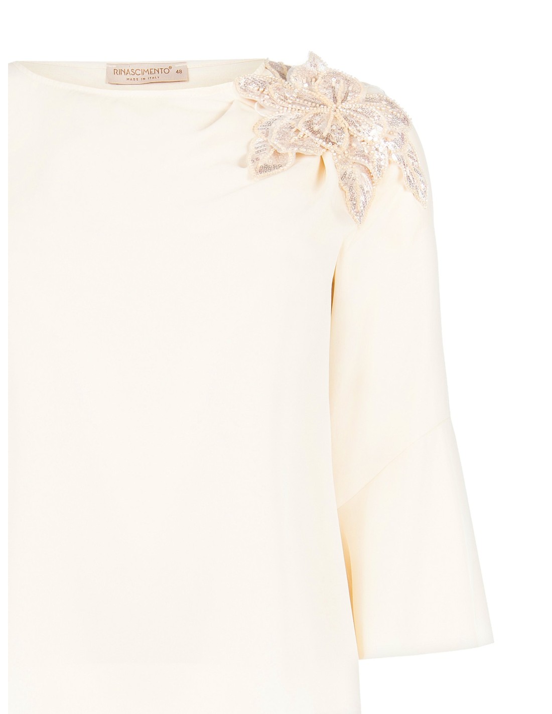 Top fluido Rinascimento Curvy, ajuste suave que desliza sem marcar. Em georgette leve com um toque sedoso, garante conforto e movimento. Decote limpo, mangas 3/4 alargadas e aplicação de lantejoulas florais no ombro: um acento brilhante que realça o decote. Perfeito para o escritório e cerimónias.