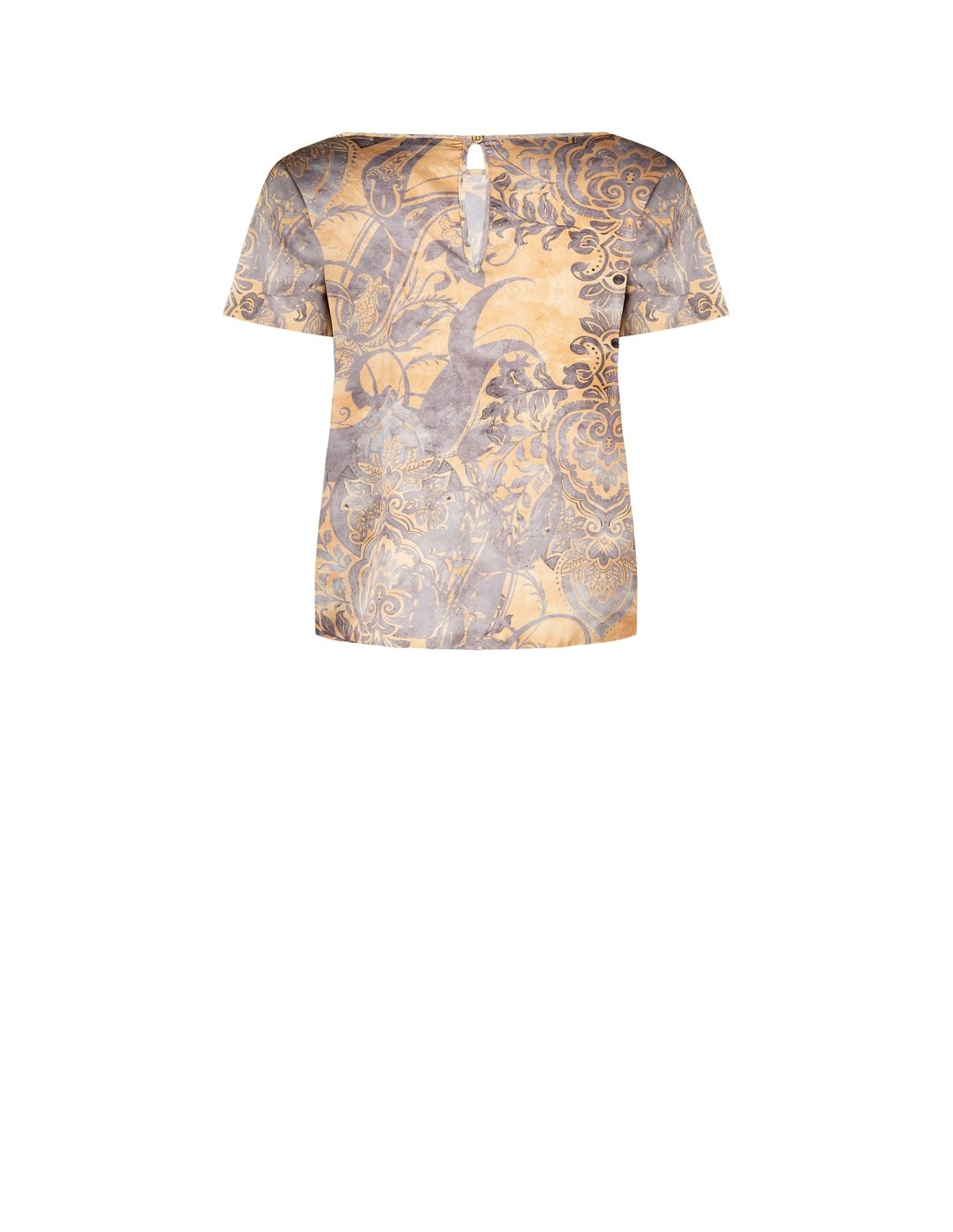 Top de corte suave e reto, em tecido leve e fluido com toque sedoso. O decote barco e a abertura em gota nas costas acrescentam feminilidade, enquanto a estampa ornamental valoriza a silhueta com elegância. Perfeito para o escritório e para looks do dia a dia cuidados.