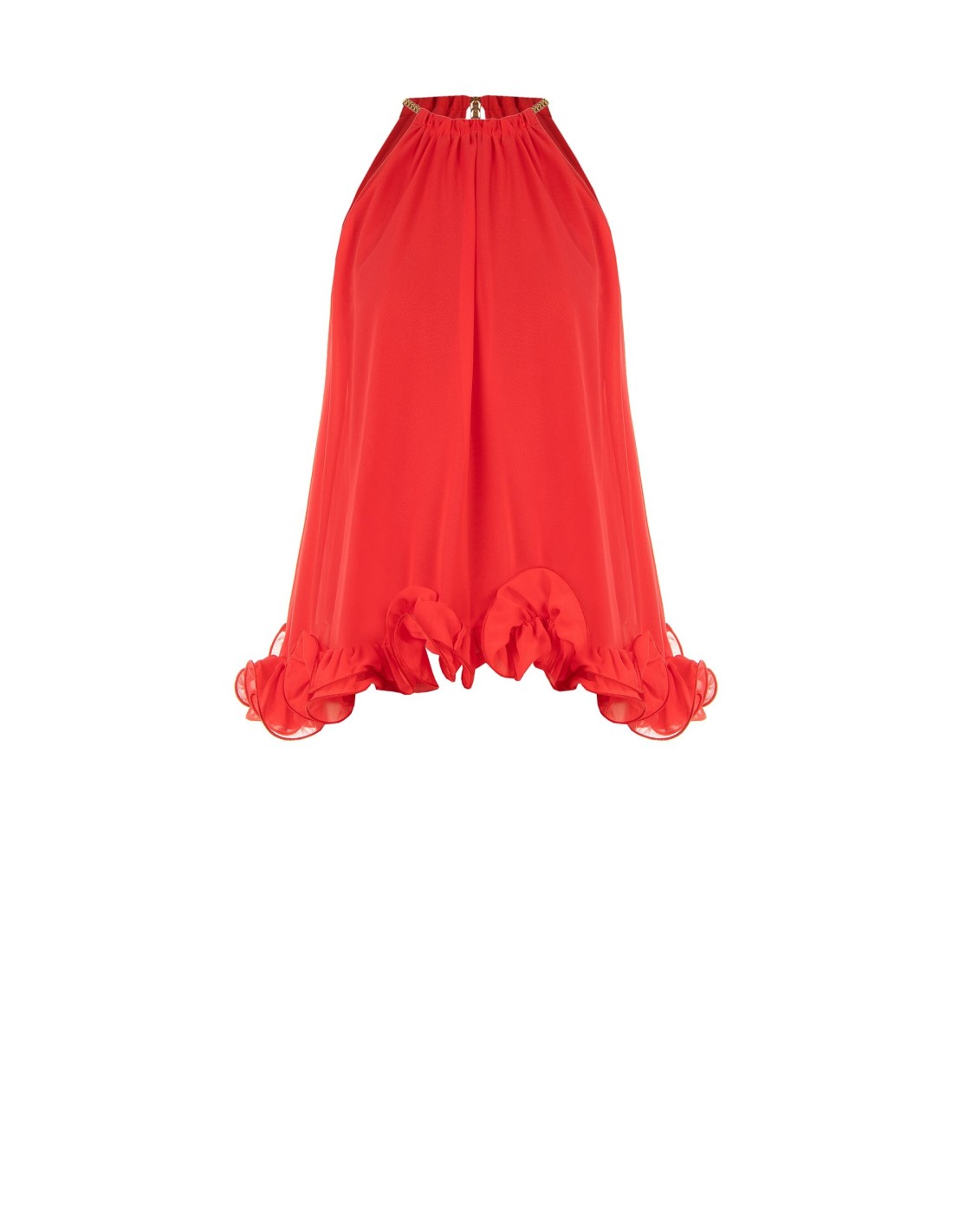 Blusa fluida com um corte macio e arejado, em tecido leve com efeito chiffon que acaricia a silhueta com conforto. O decote americano com detalhes em correntes e a bainha acabada com folhos conferem movimento e feminilidade. Perfeita para festas, jantares elegantes e ocasiões especiais.