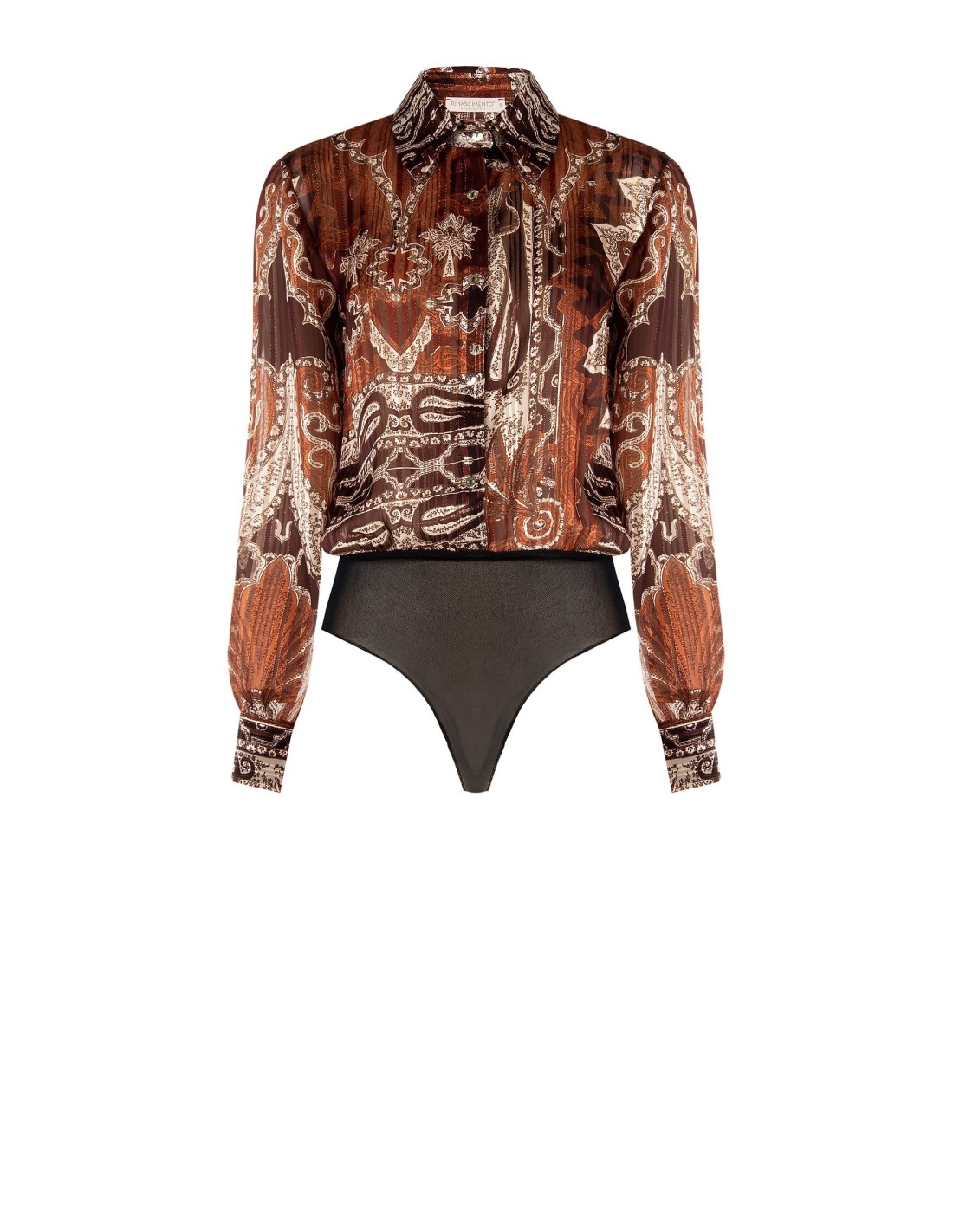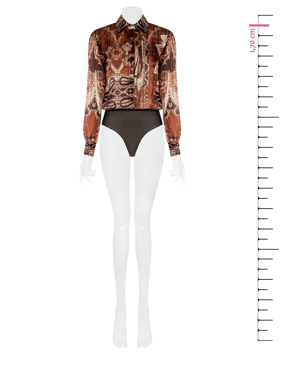 Camisola de corpo Rinascimento com um ajuste suave na parte superior e apertado na parte inferior para um ajuste sempre arrumado. Tecido leve e semi-transparente com textura brilhante. Gola estruturada, carcela de botões com botões de micro jóias e punhos altos. Perfeito para o escritório com fatos, também ideal para saídas à noite.