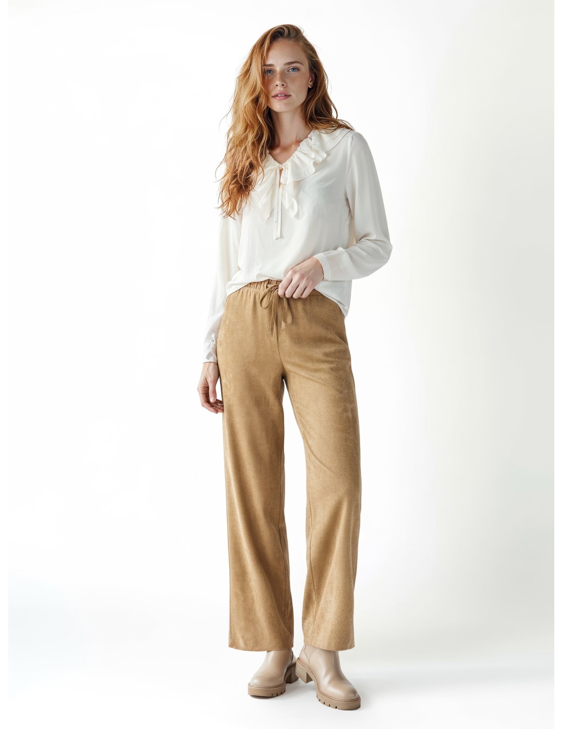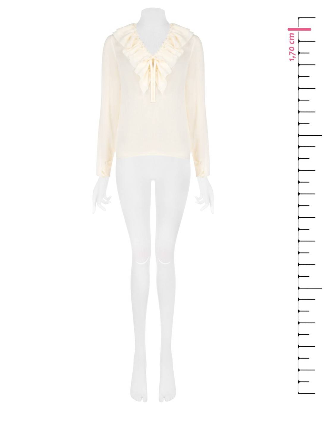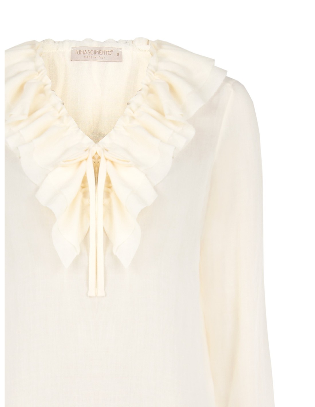 Rinascimento assina um top feminino de corte fluido que valoriza a silhueta sem marcar. Em tecido fluido e leve com toque sedoso, oferece conforto durante todo o dia. Decote em V enquadrado por folhos e laço para atar, punhos com botão. Perfeito com blazer para o escritório ou jeans para um look casual-chic do dia a dia.