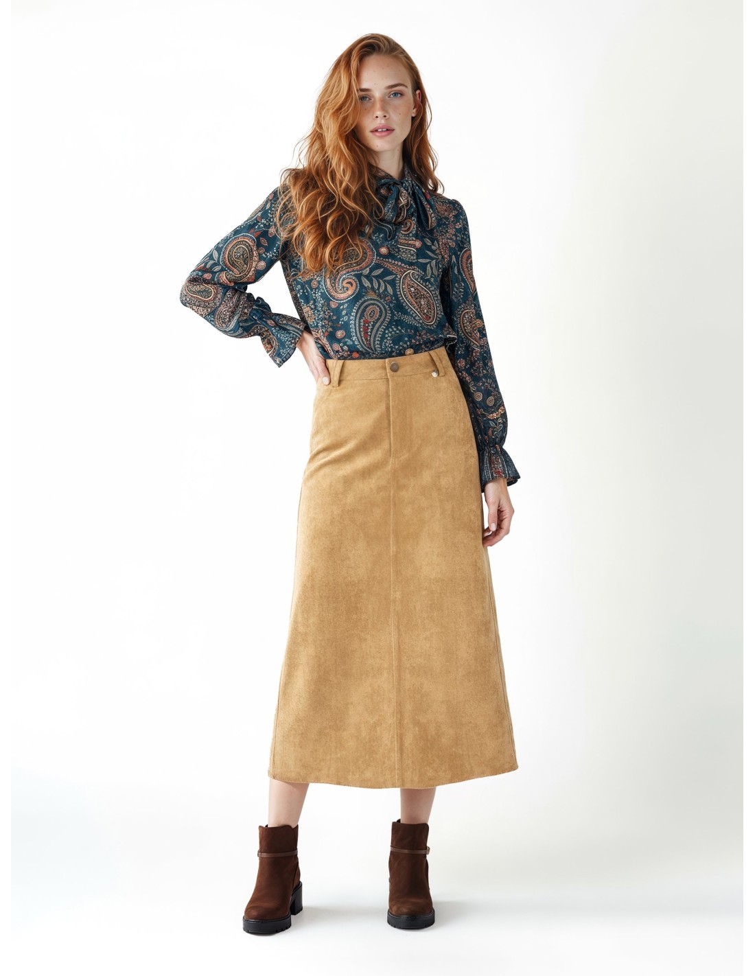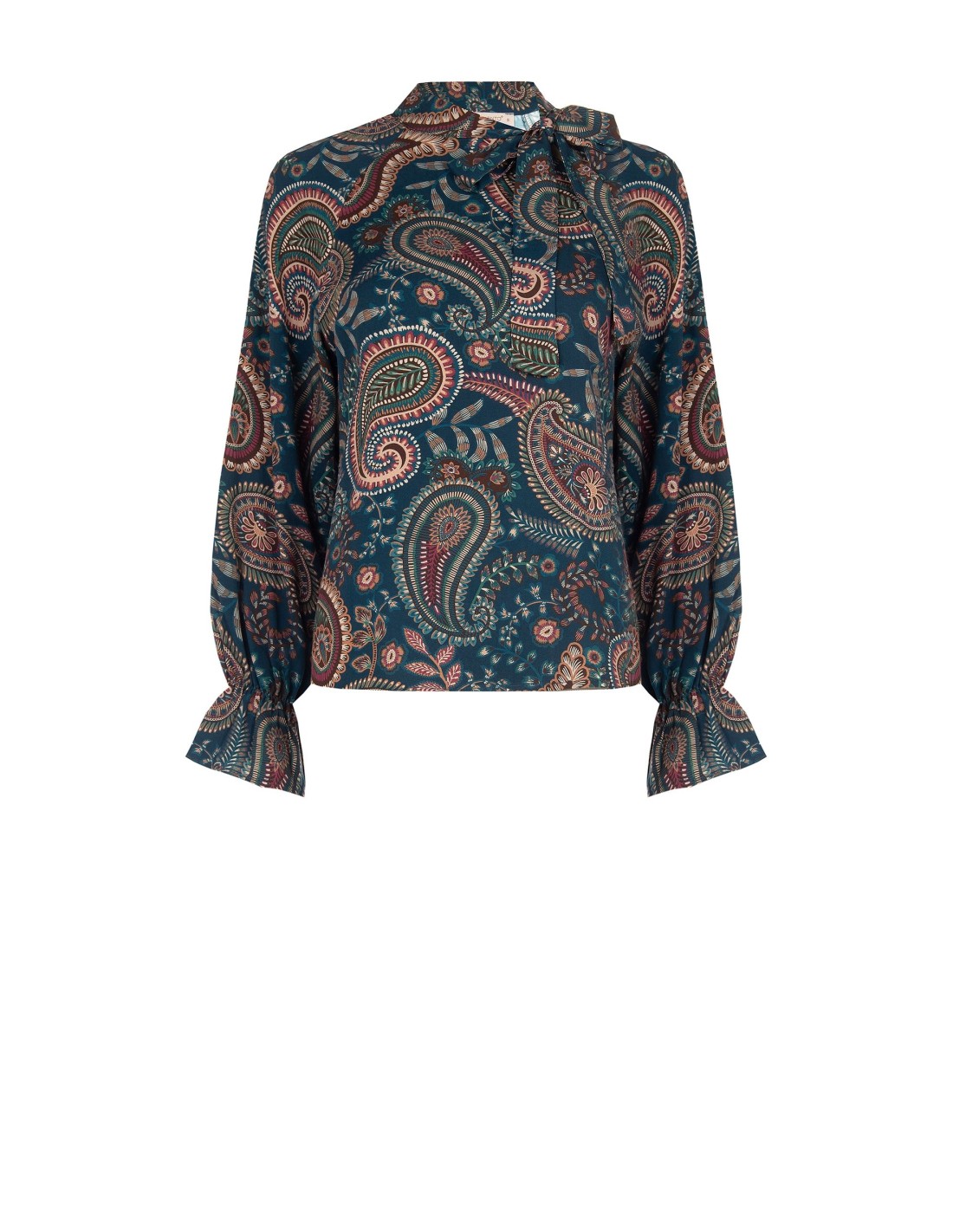 Rinascimento assina um top fluido com um corte macio que valoriza a silhueta sem apertar. Tecido acetinado leve com estampado paisley. Gola com laço para amarrar e punhos franzidos em forma de sino: detalhes que elevam o look. Perfeito do escritório ao aperitivo, com saias ou denim.