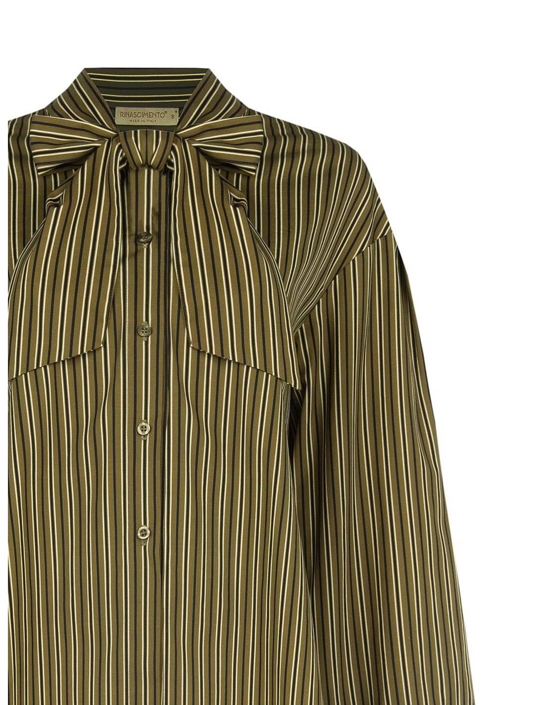 Assinada Rinascimento, esta camisa de corte suave desliza sobre o corpo valorizando a silhueta. Em popeline leve com textura riscada, garante conforto ao longo do dia. Detalhes distintivos: laço no decote removível e punhos largos com botões. Perfeita para o escritório e para looks do dia para a noite.