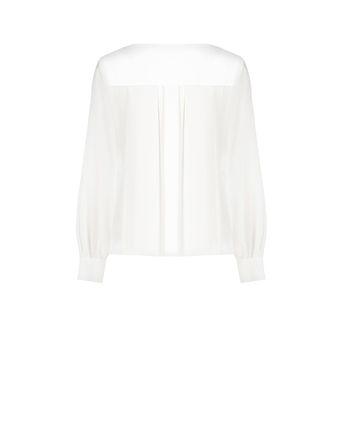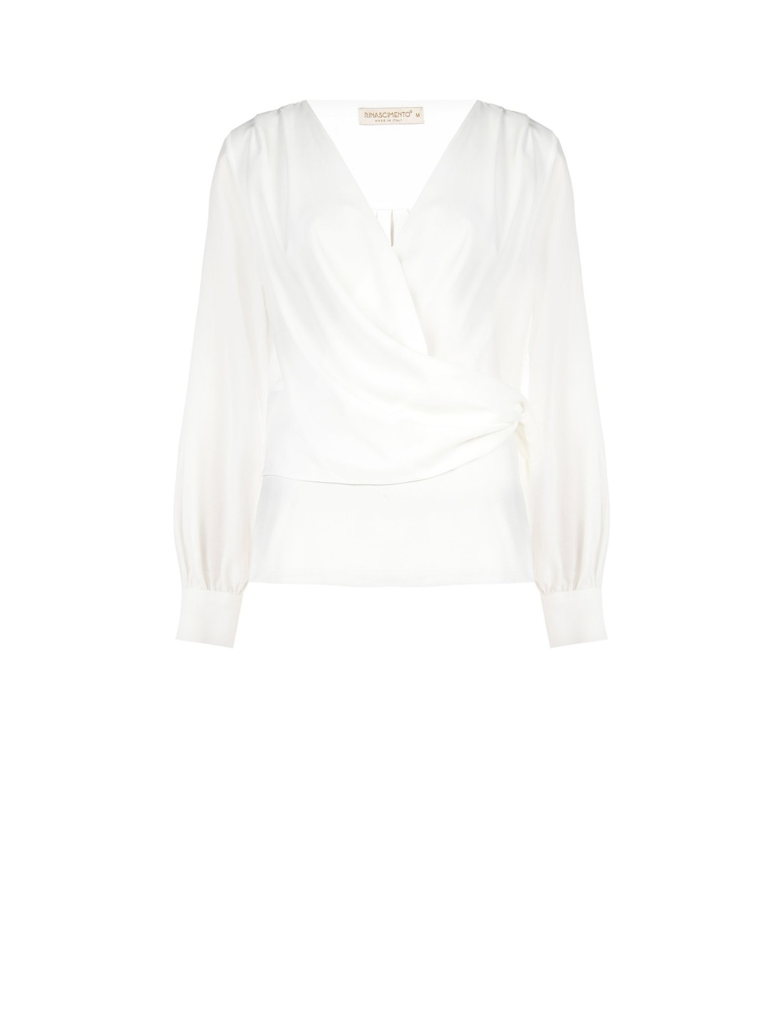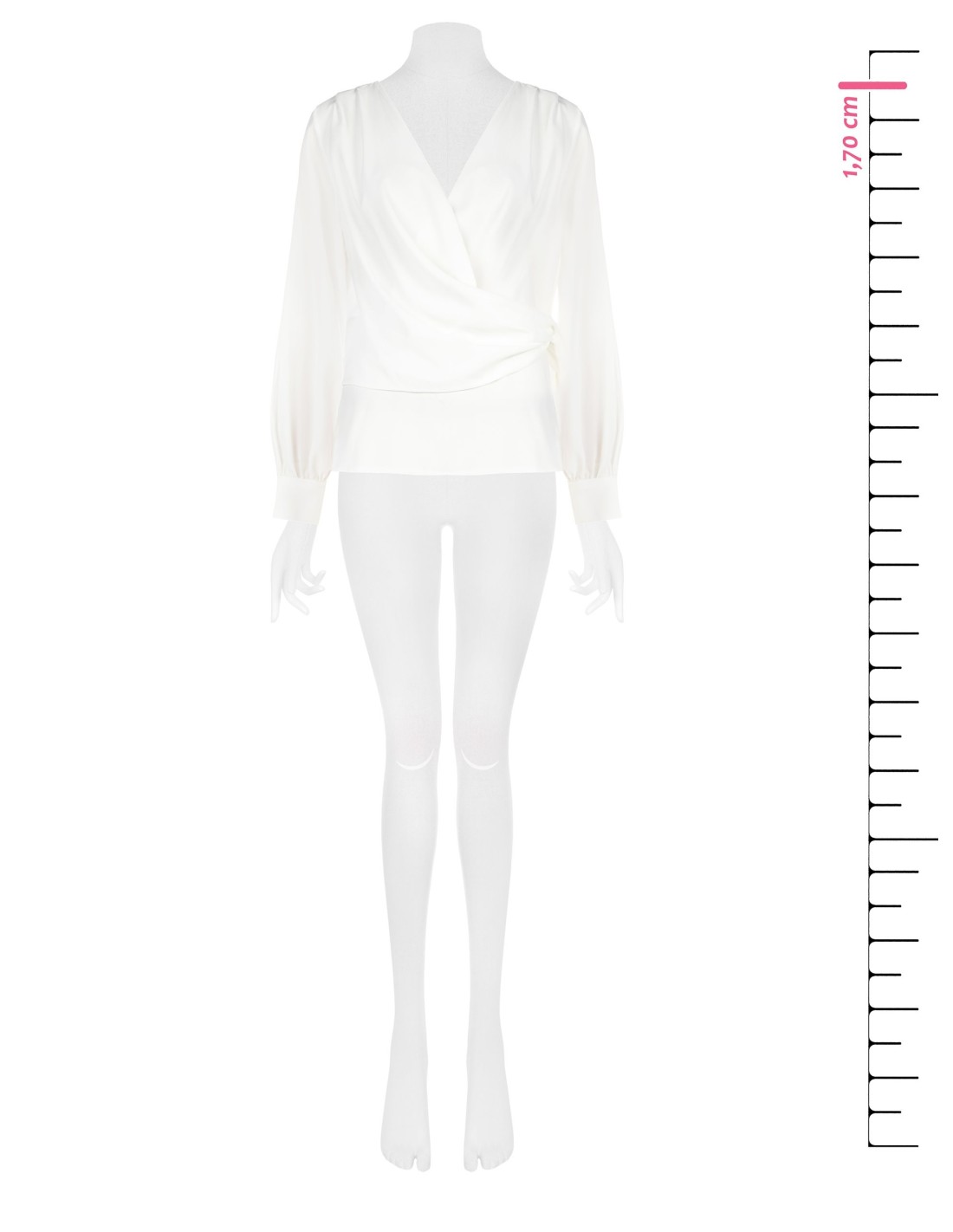 Top fluido com corte suave que valoriza a silhueta com cruzamento na frente e delicado drapeado lateral. Confeccionado em tecido leve com efeito sedoso, tem mangas compridas ligeiramente transparentes com punhos estruturados. Perfeito do escritório ao aperitivo.