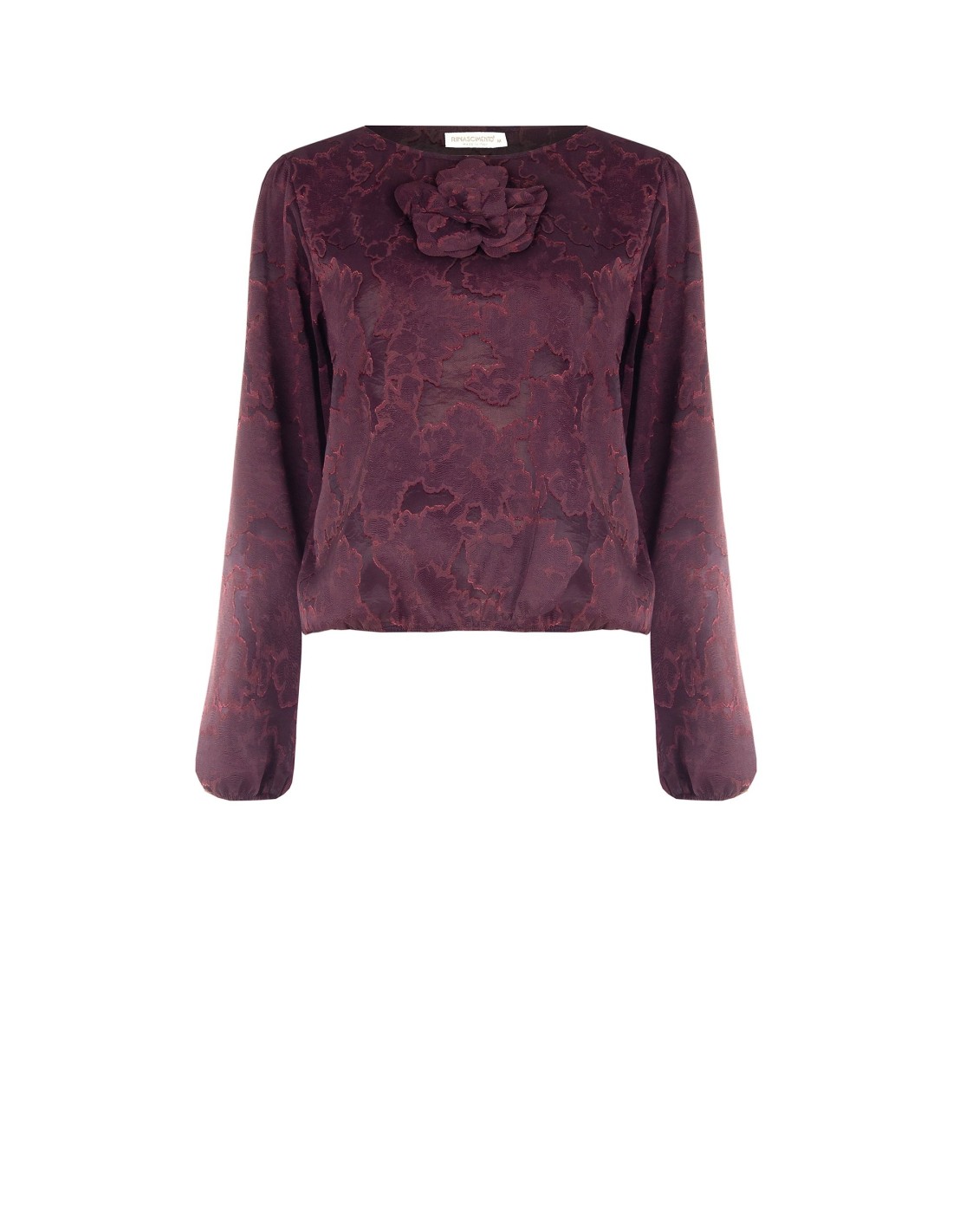 Top com corte macio e feminino, em jacquard leve com agradável toque acetinado. Mangas amplas com punho elástico e aplicação floral no decote que ilumina o rosto. Perfeito por baixo de blazer para o escritório ou com denim e saltos para o aperitivo: valoriza a silhueta sem apertar.