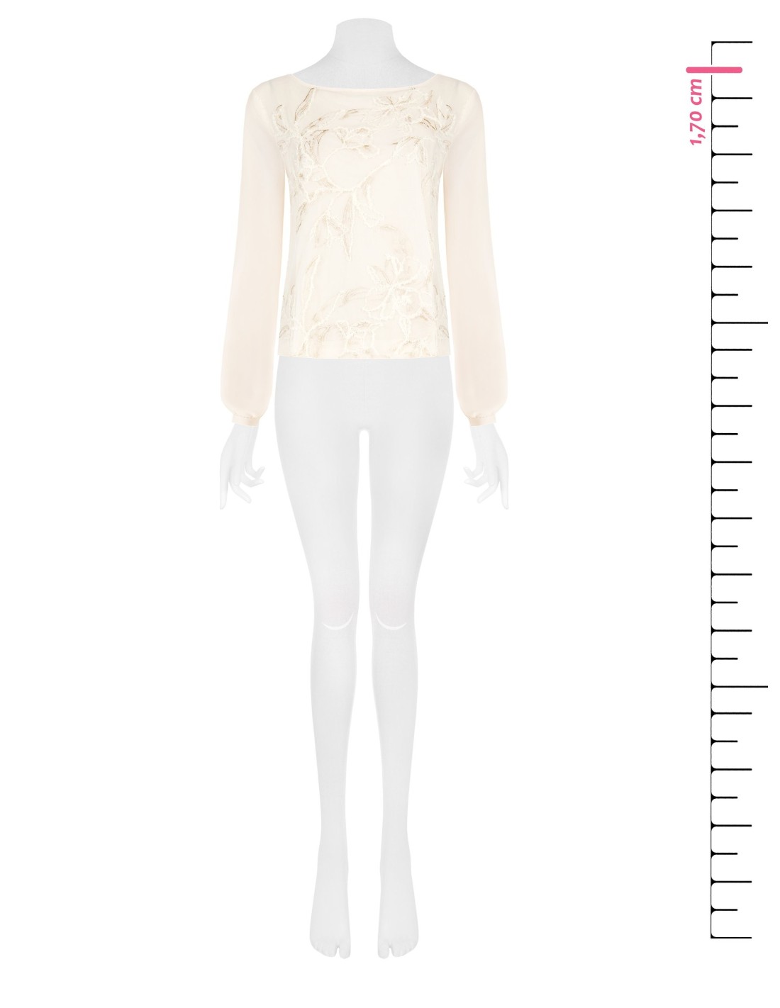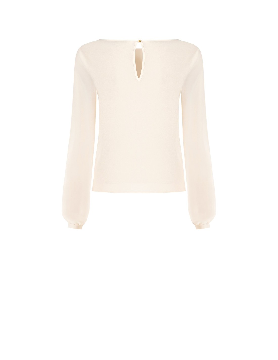 Top com corte reto e fluido, com o corpo em tecido leve enriquecido com bordado floral em relevo e mangas em voile transparente. O decote suave e a abertura em gota nas costas valorizam a silhueta. Perfeito com tailleur de escritório ou calças elegantes para a noite.