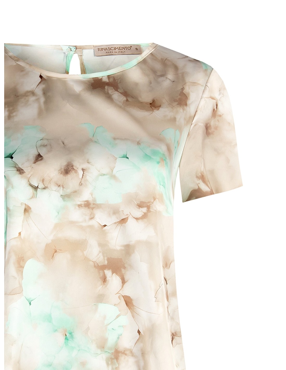 Top fluido em tecido acetinado leve, de corte reto que roça a silhueta sem marcar. A estampa degradada acrescenta movimento, enquanto a gota nas costas com botão tipo joia ilumina a nuca. Perfeito com calças de alfaiataria para o escritório e looks quotidianos cuidados.