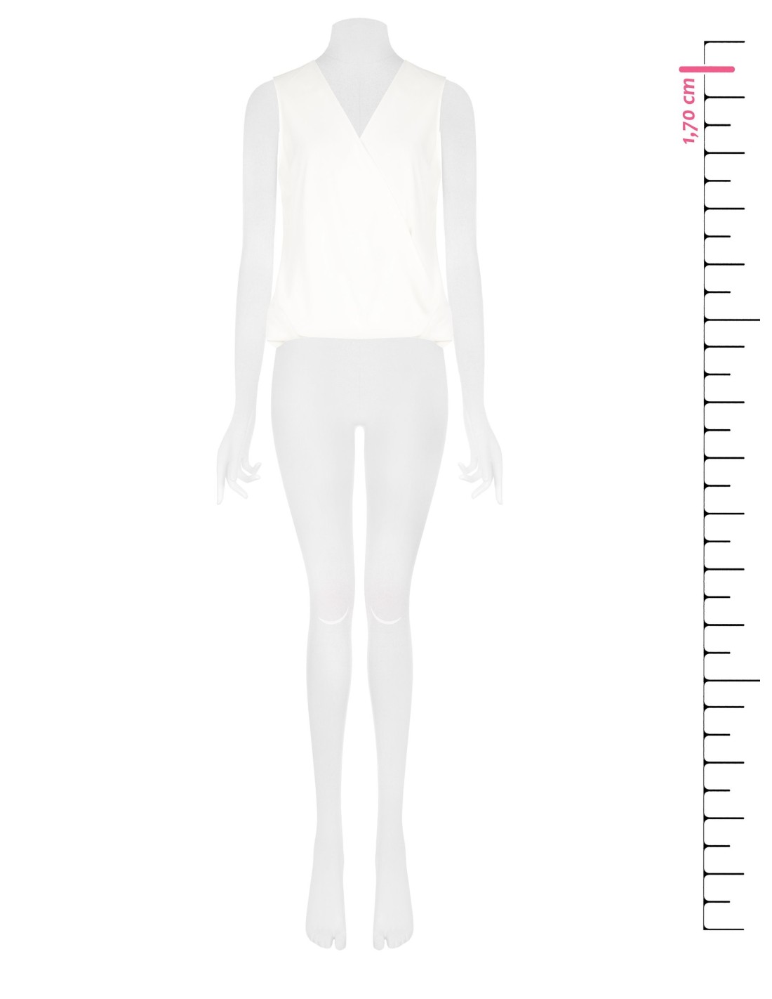 Blusa sem mangas com um corte macio e fluido, em tecido liso com toque leve que acaricia a silhueta com conforto. O decote em V cruzado e a bainha com efeito blusado acrescentam feminilidade e versatilidade. Perfeita para o escritório e para looks do dia a dia refinados.