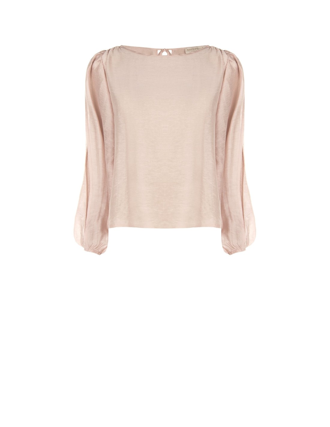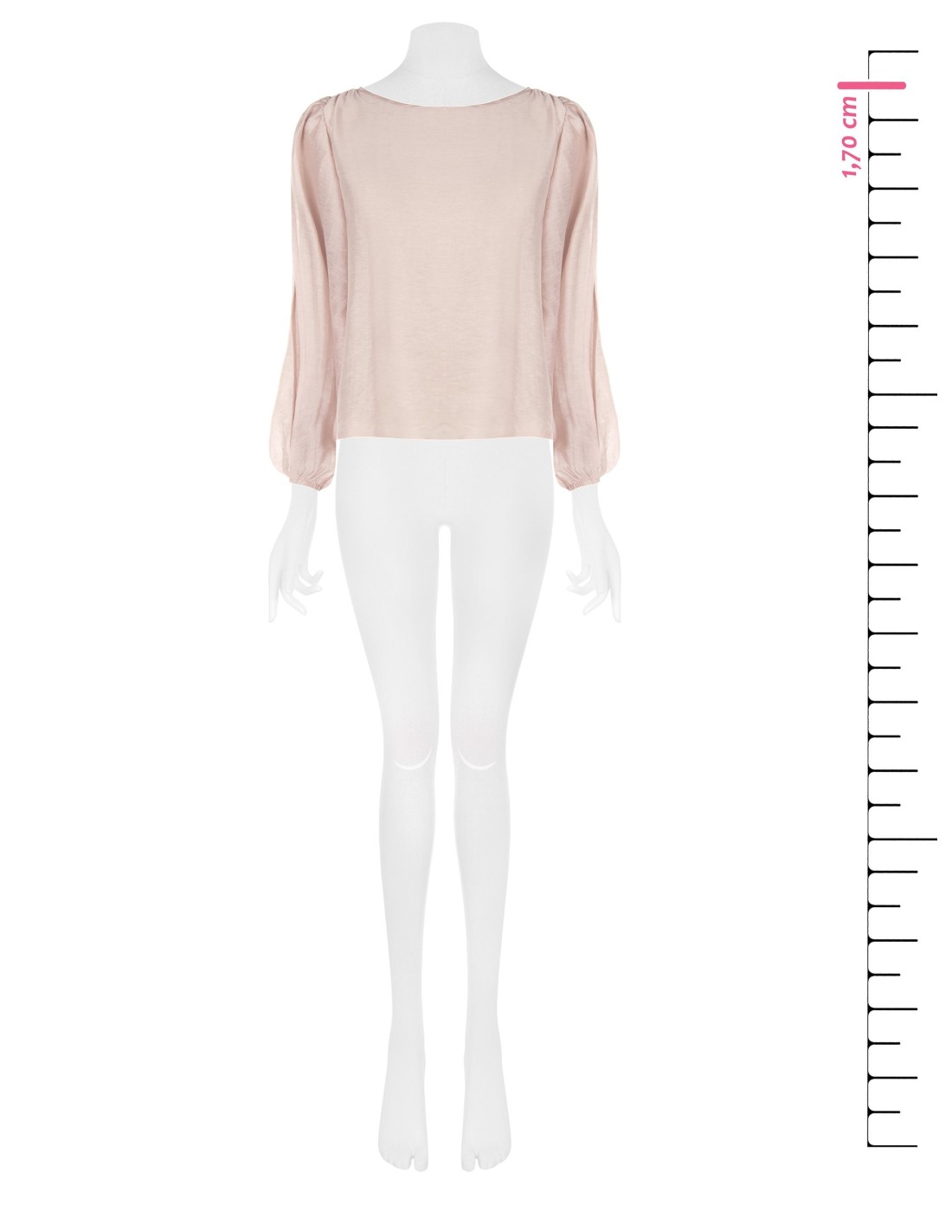 Top de corte suave e fluido, em tecido leve com textura acetinada que acaricia a silhueta com conforto. O decote barco, as mangas volumosas com punhos elásticos e o cordão nas costas tornam-no versátil: perfeito no escritório, à noite ou para o dia a dia.