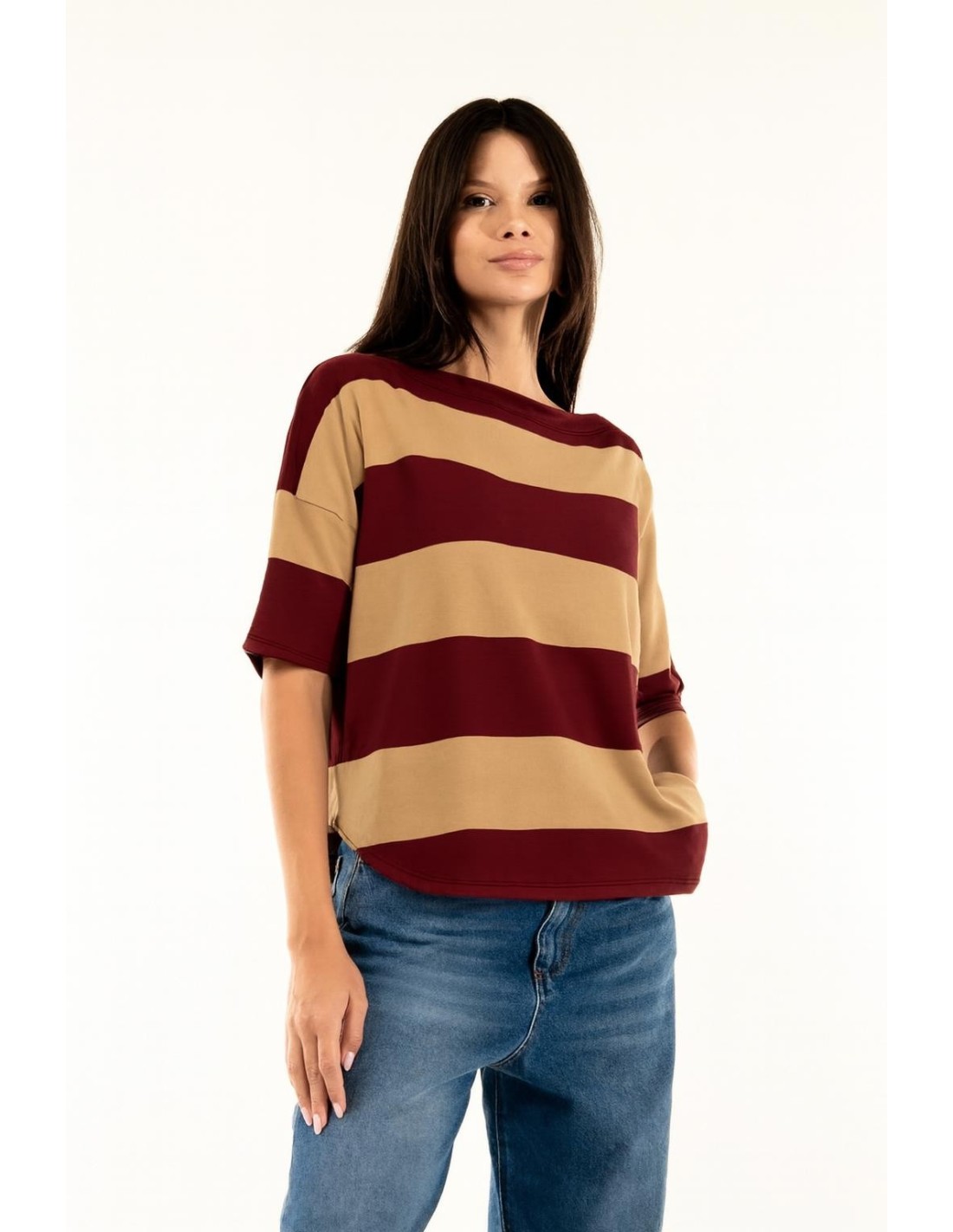 Top às riscas macio com um corte solto: cai com fluidez e não marca, valorizando a silhueta. Camisola leve que se sente bem na pele. Decote à barco e mangas de comprimento médio com ombros caídos para uma atitude descontraída mas cuidada. Perfeito para o dia a dia e para o lazer, fácil de combinar com ganga ou alfaiataria.