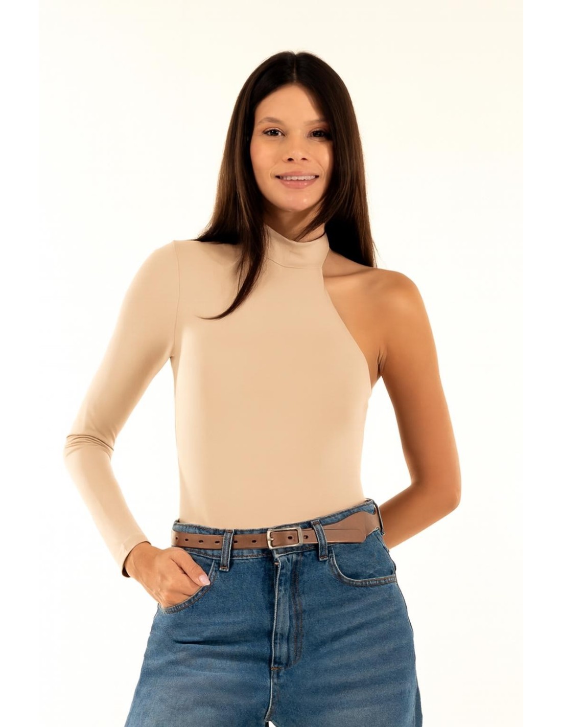 Camisola de manga comprida em jersey elástico suave para maior conforto e ajuste. O decote de um ombro só com gola subida realça a silhueta; fecho de botão de pressão no entrepernas para maior praticidade. Perfeito sob um blazer para o escritório ou com calças de ganga e saltos altos para a noite. Contemporânea e versátil.