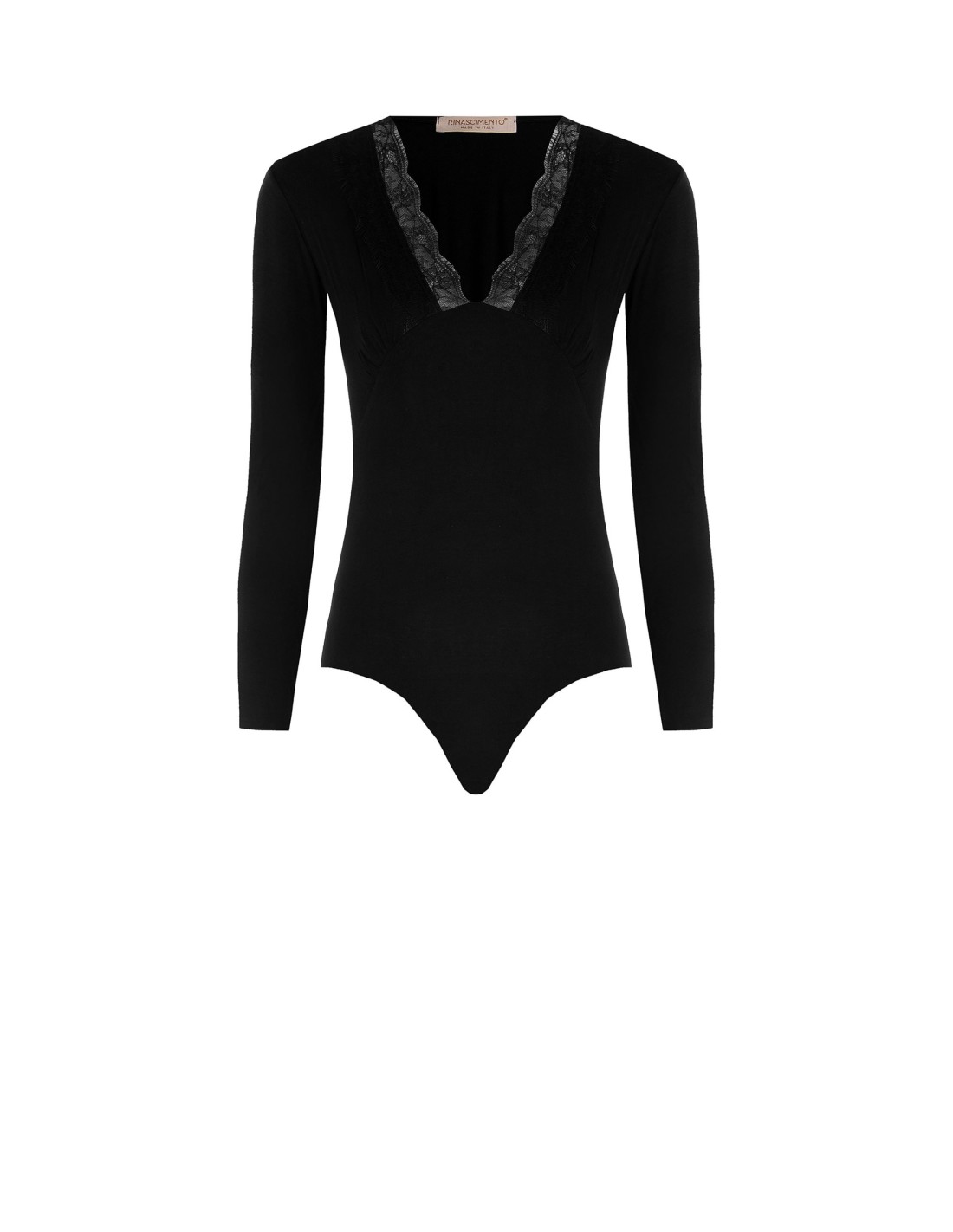 Body de mangas compridas com corte ajustado que valoriza a silhueta. Jersey macio e elástico com aplicações em renda no decote profundo em V. Fecho com botões de pressão na entreperna para maior praticidade. Perfeito por baixo de blazer para o escritório ou com denim para um look everyday chic.