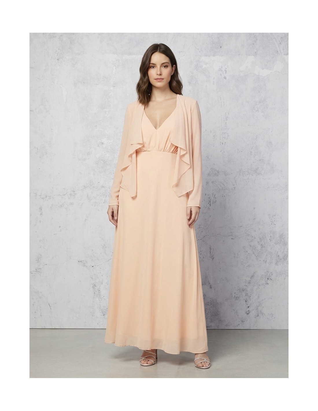 Bolero leve de corte macio e fluido, em georgette impalpável que acaricia a silhueta com conforto. A frente aberta e as lapelas drapeadas acrescentam movimento e elegância. Perfeito sobre vestidos e tops para cerimónias, festas ou looks de noite.