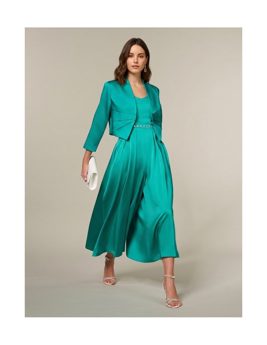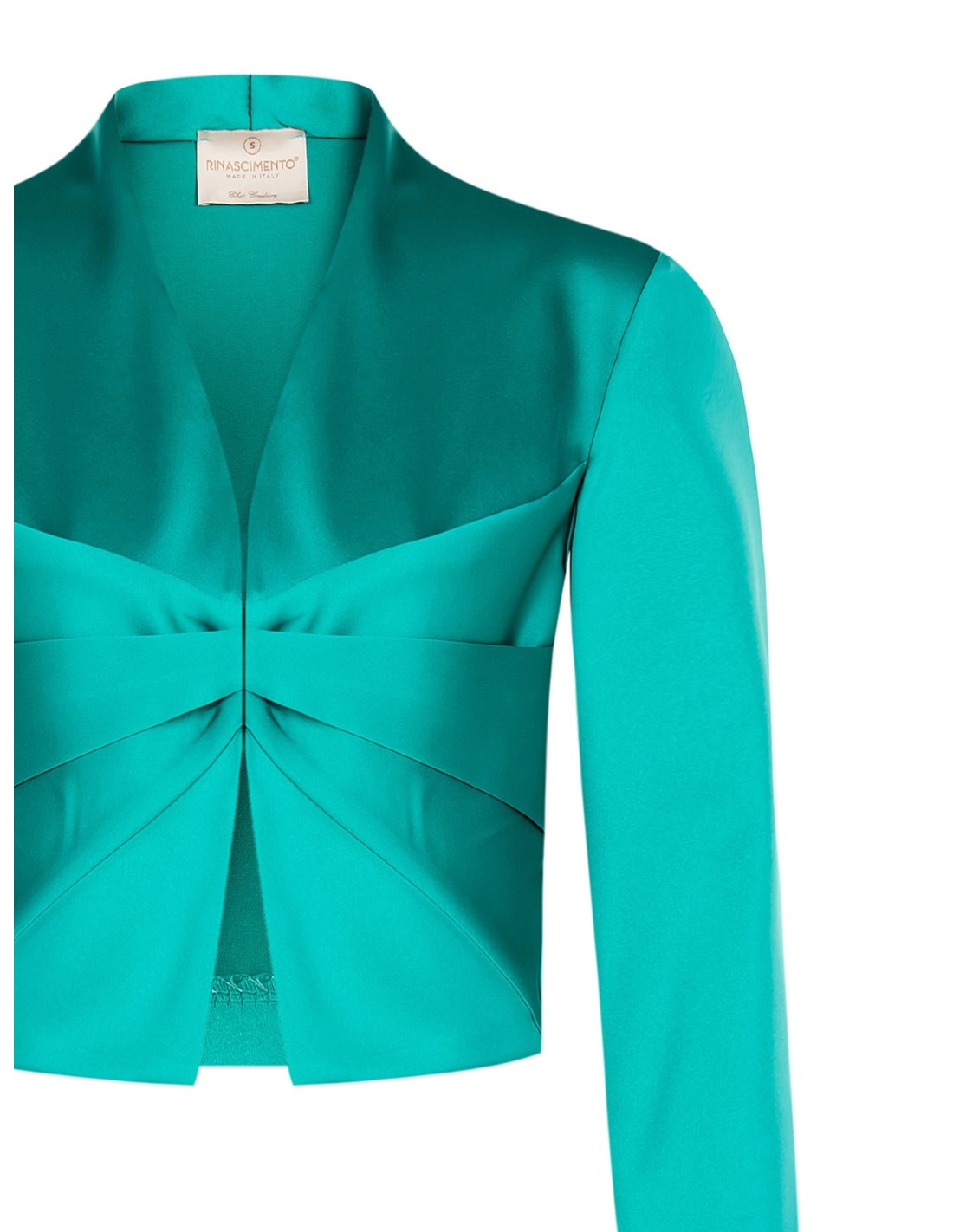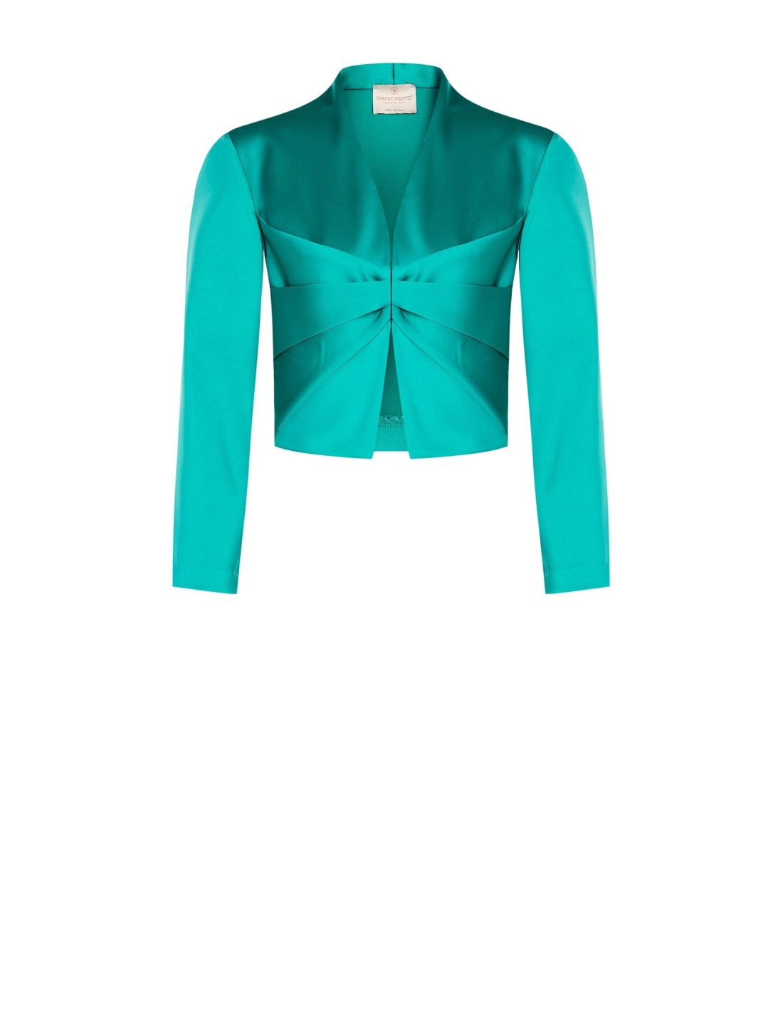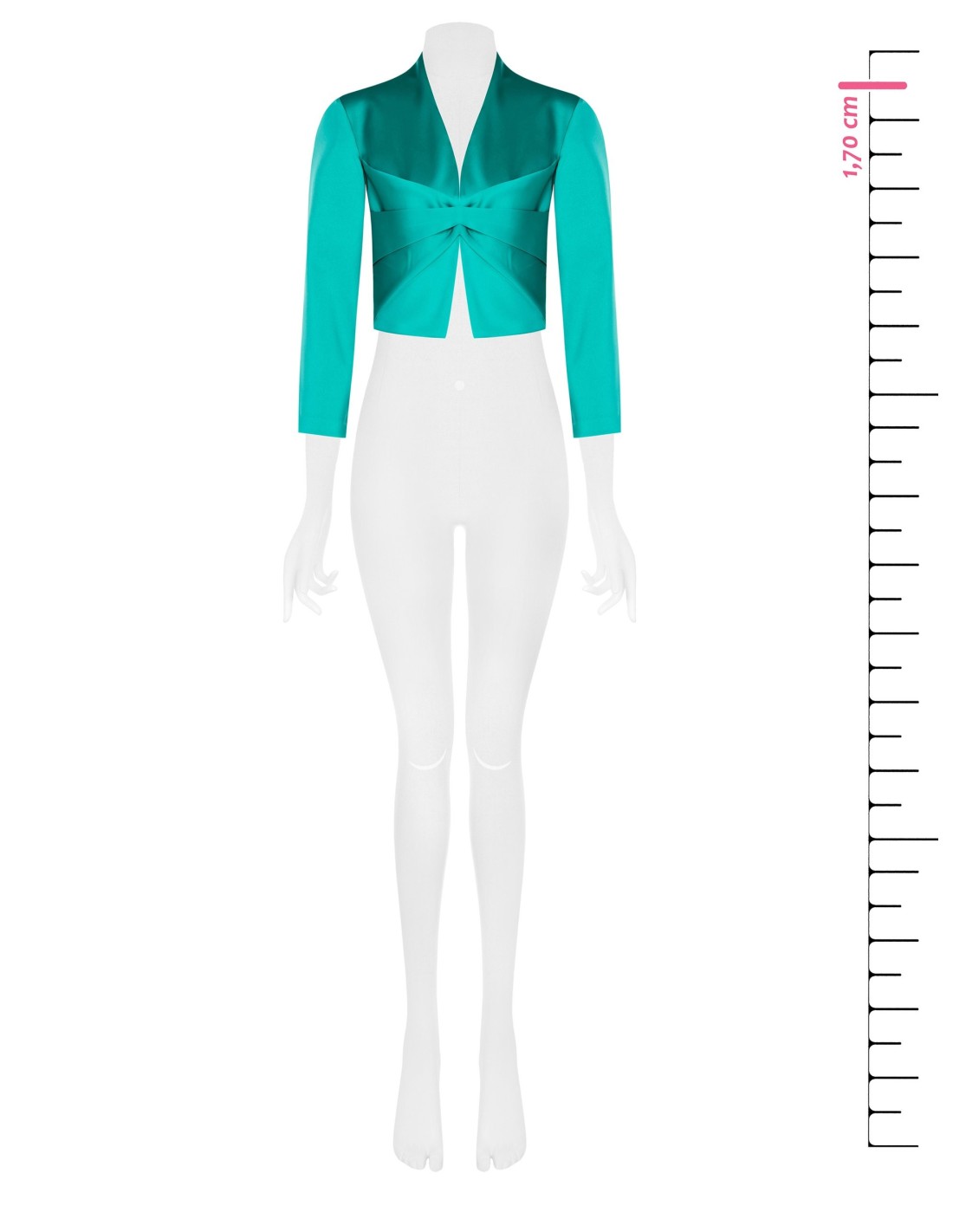 Casaco curto de corte justo, realizado em satin com textura fluida e luminosa. O decote em V e o trabalho drapeado na frente valorizam a silhueta com leveza, enquanto o fecho discreto garante conforto. Perfeito sobre vestidos elegantes, para cerimónias, festas ou eventos especiais.