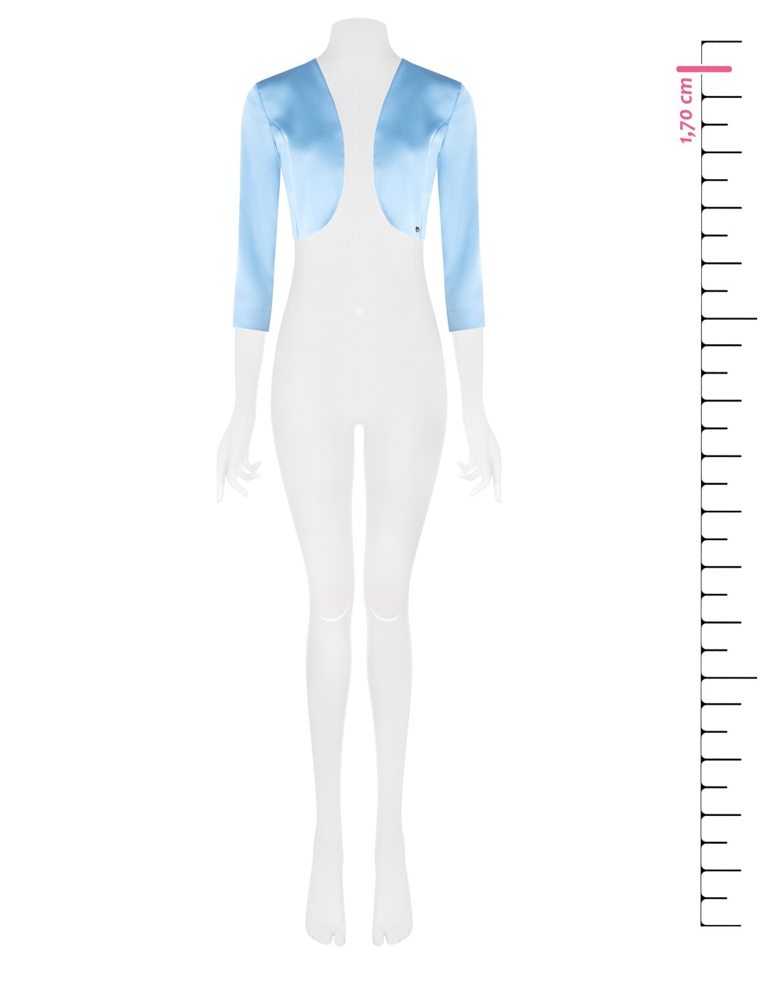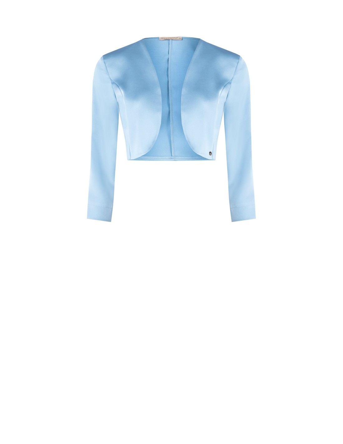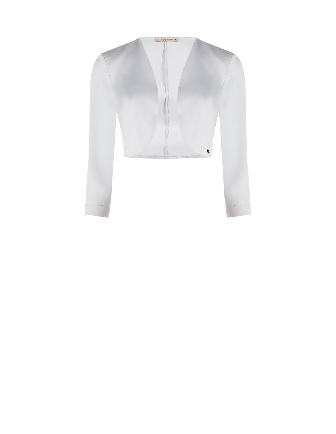 Bolero curto com corte ajustado que esculpe a silhueta. Confeccionado em cetim liso e ligeiramente stretch para conforto e brilho. Corte aberto com decote arredondado e mangas 3/4; micro medalha com logótipo na borda. Perfeito sobre vestidos e tops para cerimónias, festas ou ocasiões especiais.