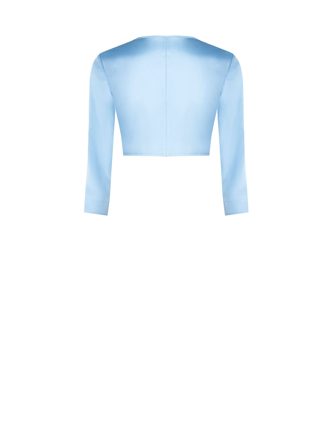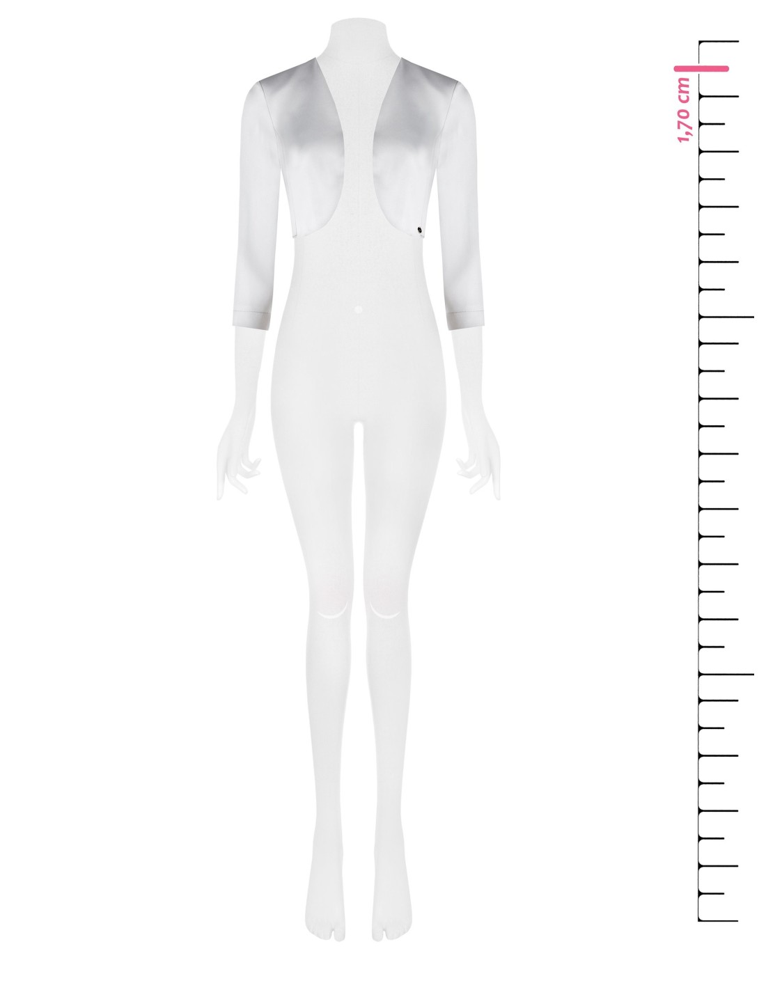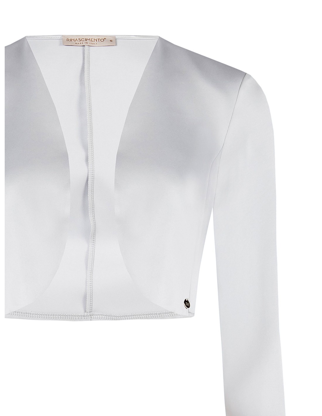 Bolero curto com corte ajustado que esculpe a silhueta. Confeccionado em cetim liso e ligeiramente stretch para conforto e brilho. Corte aberto com decote arredondado e mangas 3/4; micro medalha com logótipo na borda. Perfeito sobre vestidos e tops para cerimónias, festas ou ocasiões especiais.