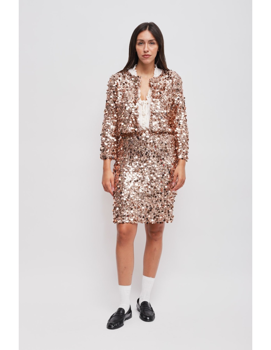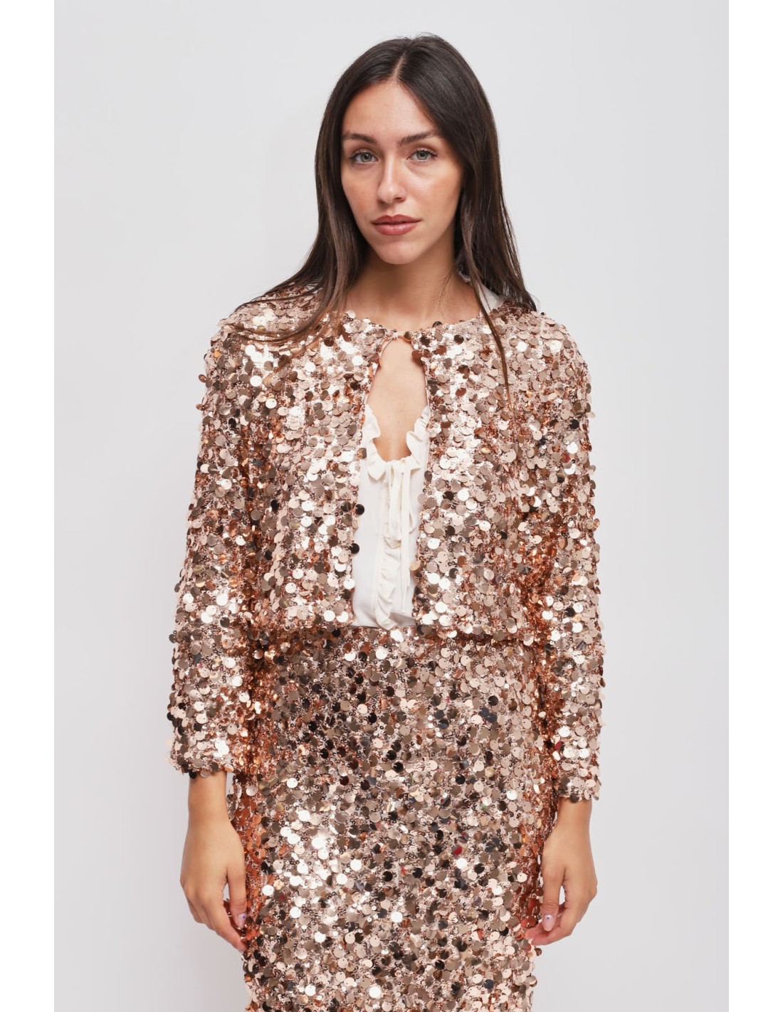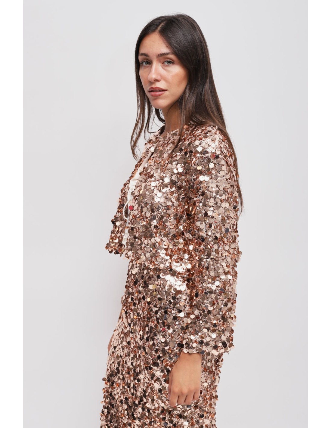 Maryley assina um bolero curto com um corte suave, ligeiramente boxy, que valoriza a silhueta sem apertar. Base têxtil confortável revestida de maxi lantejoulas em relevo. Gola redonda com fecho de gancho e mangas compridas. Perfeito sobre tops e vestidos para festas, cerimónias ou para dar carácter ao aperitivo.