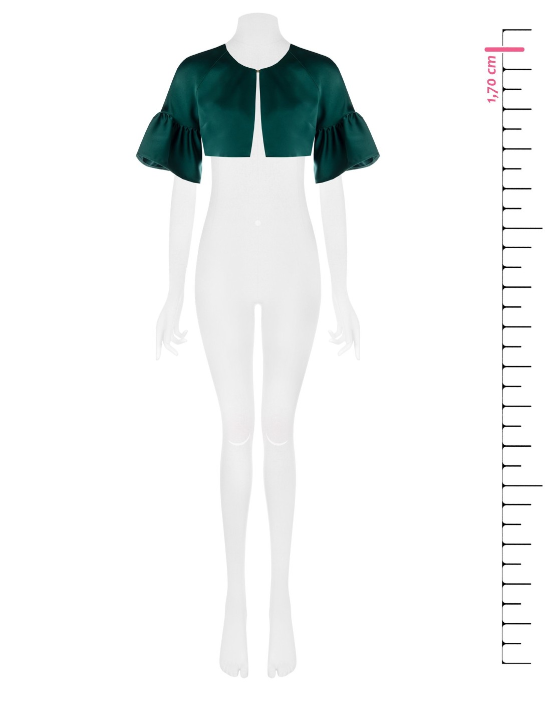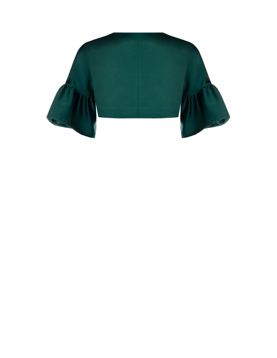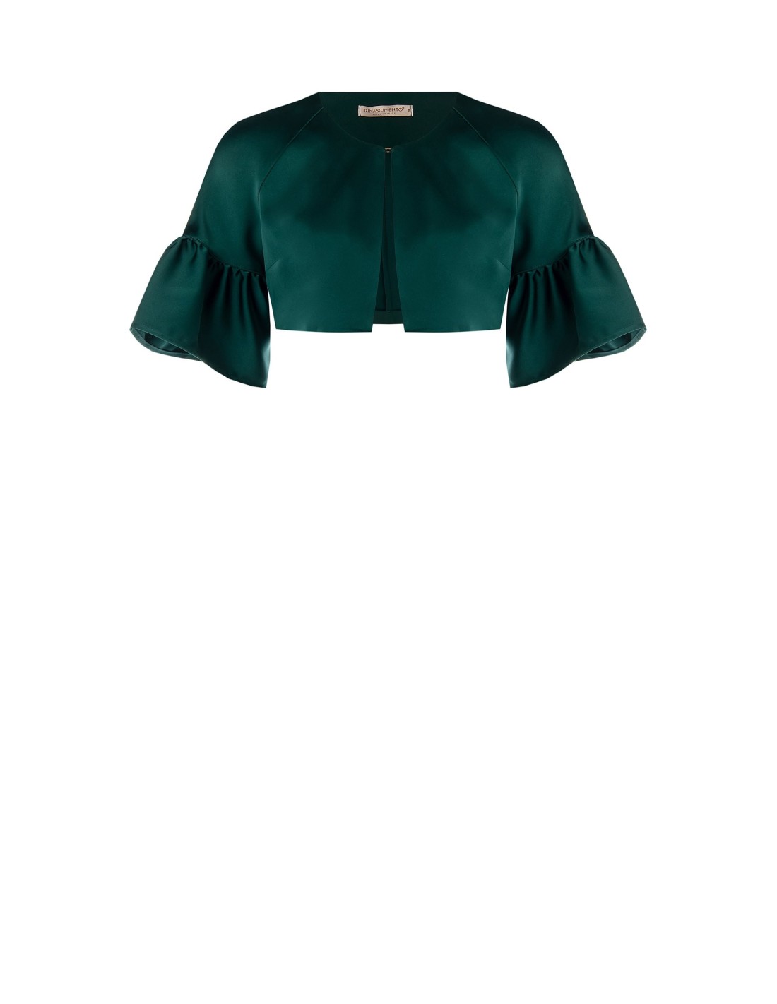 Rinascimento apresenta um bolero curto com um corte suave e feminino. Satinado liso e luminoso para um toque sedoso, forrado para maior conforto. Mangas 3/4 com folho e fecho com gancho escondido valorizam a silhueta e os looks de cintura alta. Perfeito sobre vestidos de cerimónia, para festas e cocktail.