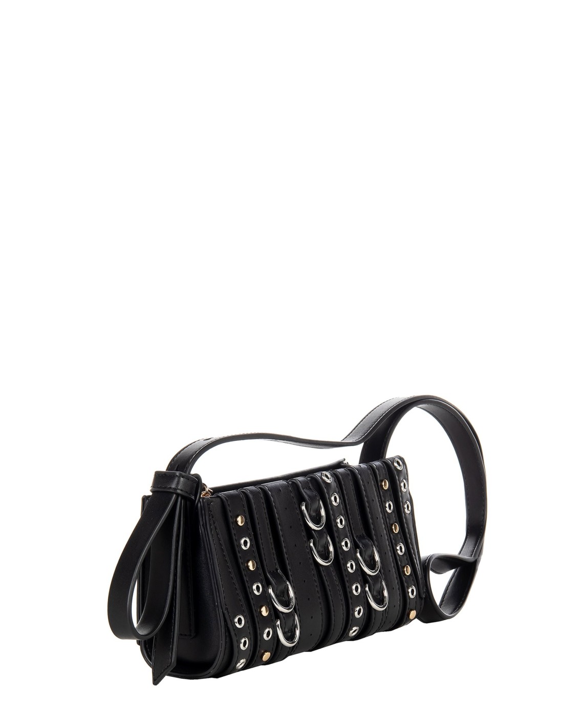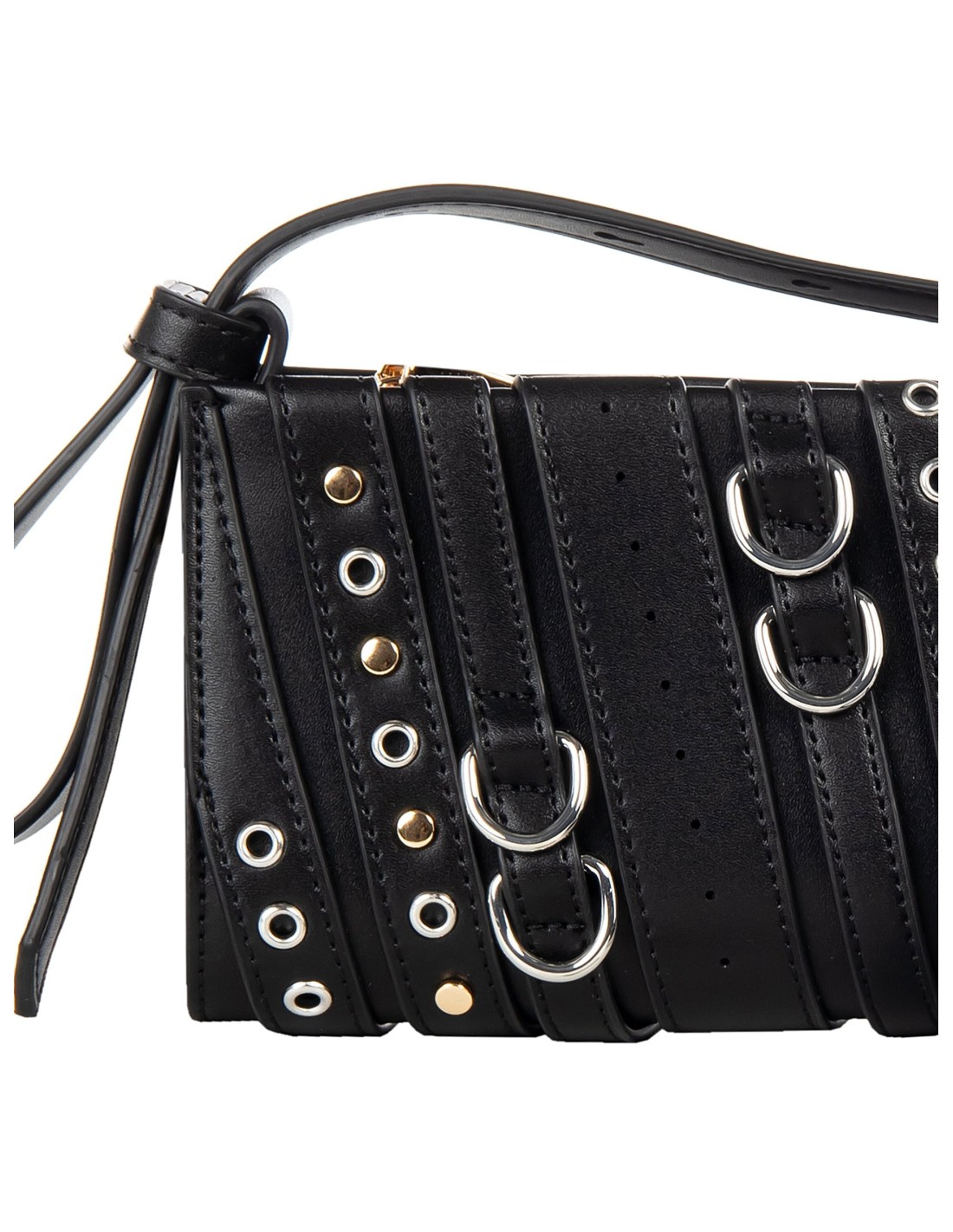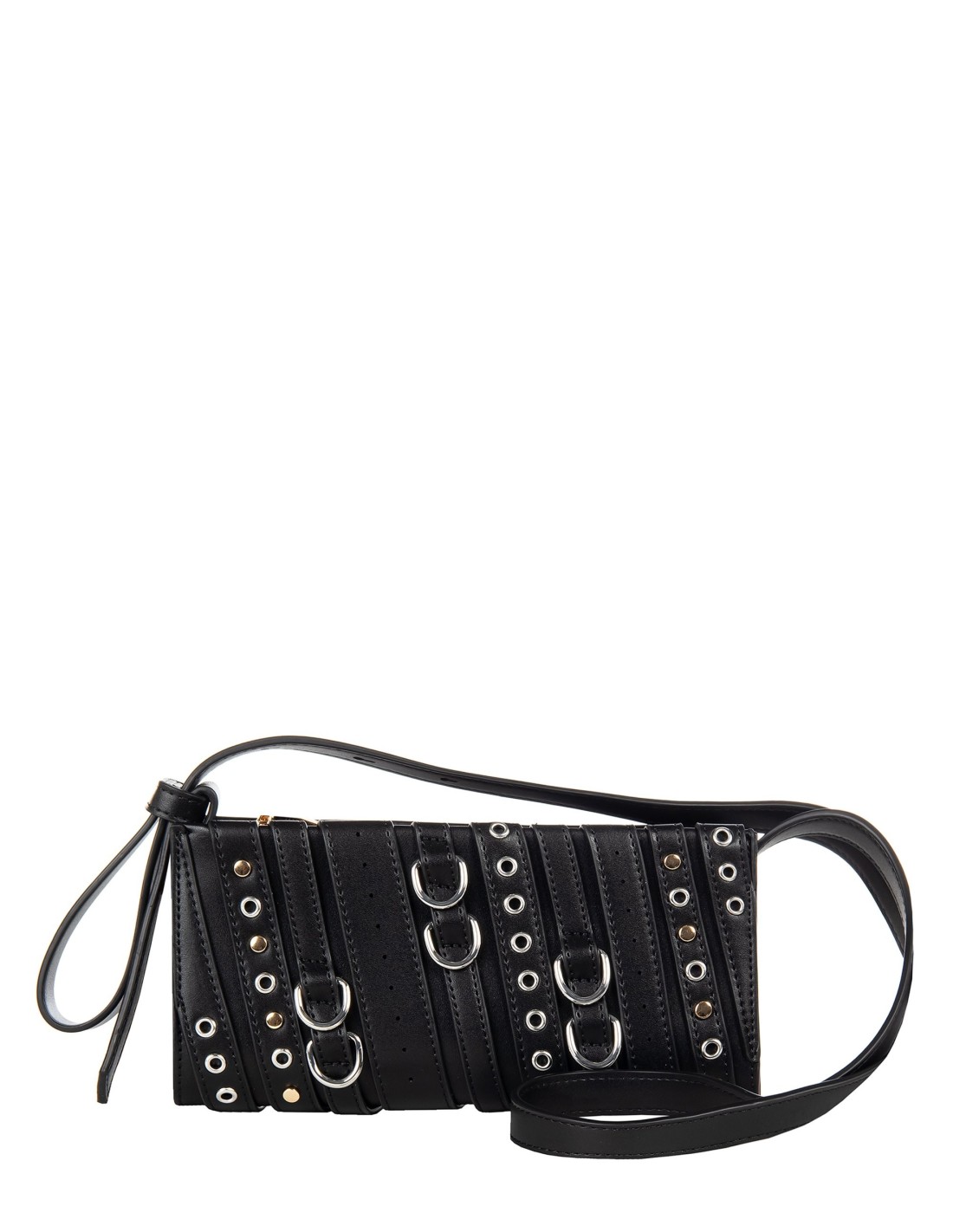 Mini alça de ombro com um ajuste compacto que deixa as suas mãos livres. Fabricada em couro sintético macio e de grão liso com faixas com efeito de cinto, ilhós e argolas de metal. Fecho de correr e alça de ombro ajustável para um conforto à medida. Perfeita para as noites e festas, também confere carácter aos looks do dia a dia. Marca: Rinascimento.