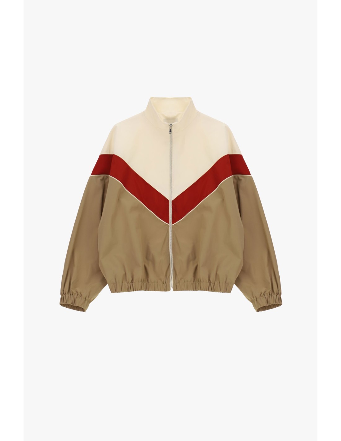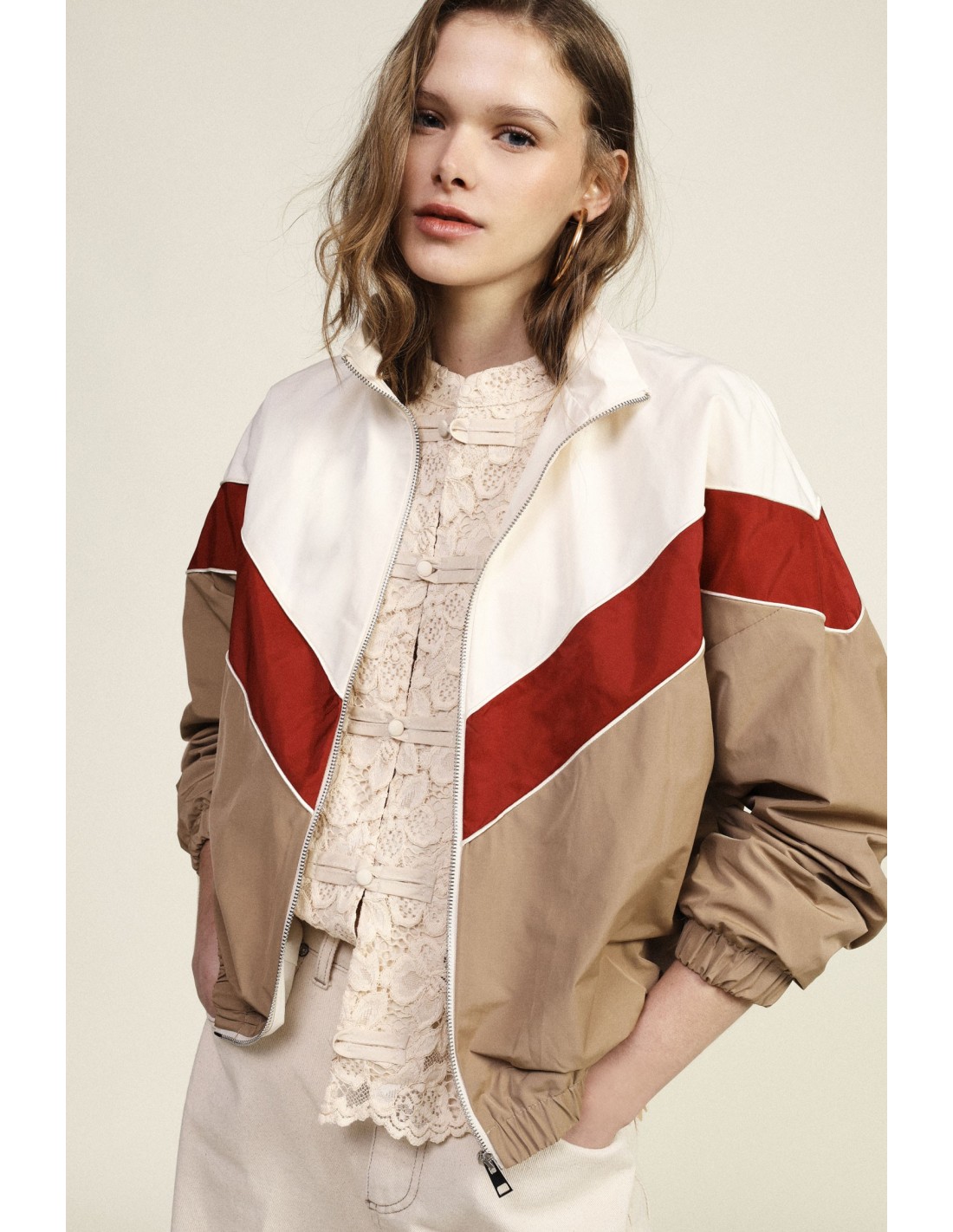 Deixa-te surpreender pelo design gráfico deste bomber com fecho de correr. A sua silhueta confortável, enriquecida por um motivo em V no peito e punhos elásticos, acompanha-te nas atividades quotidianas com um toque original. Perfeito para quem gosta de se destacar sem renunciar à praticidade e à feminilidade.