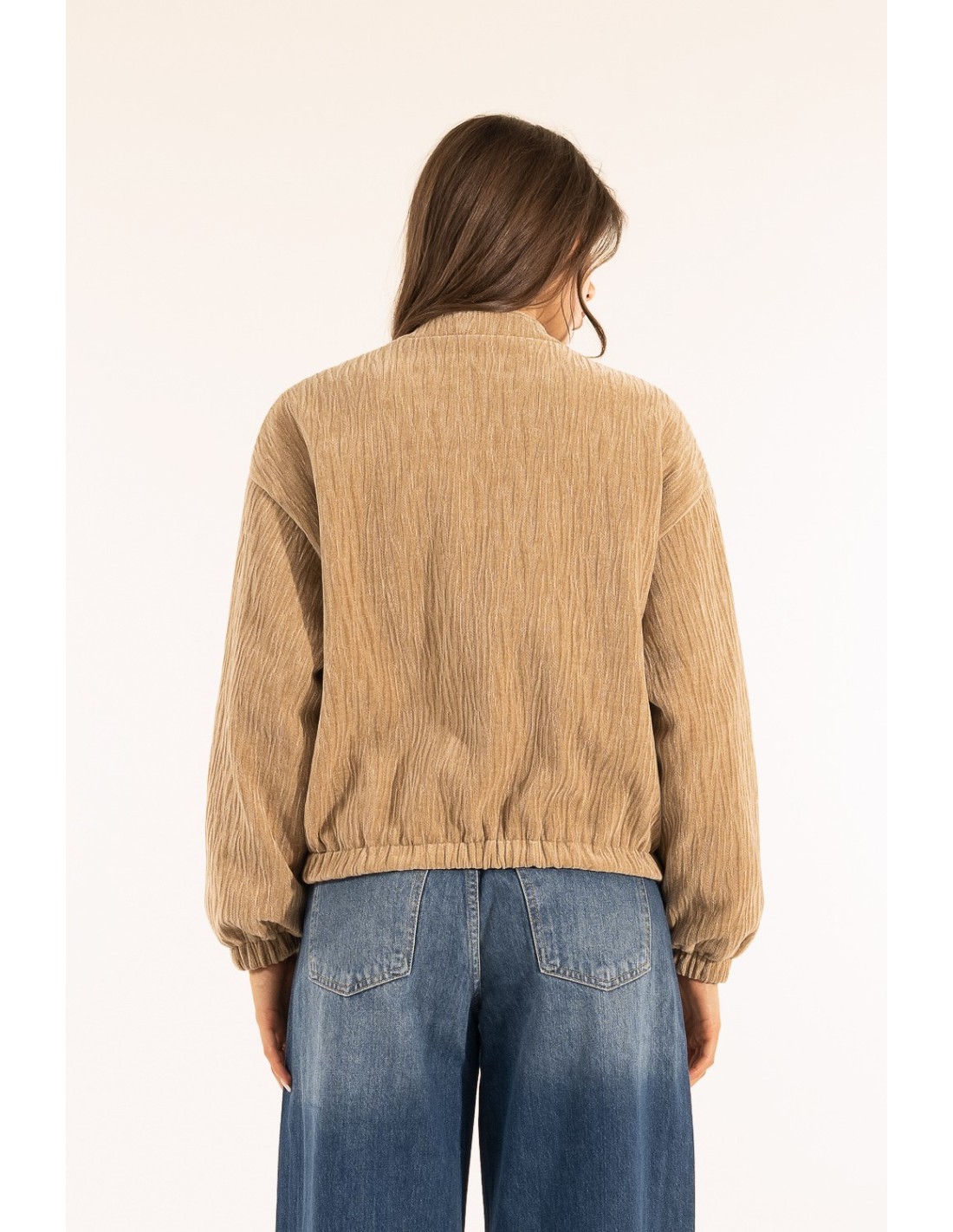 Kontatto assina um casaco curto com um corte suave e feminino, que valoriza a cintura graças à bainha elástica. Veludo cotelê leve com efeito ondulado, agradável ao toque. Gola à coreana e fecho de correr de comprimento total, com bolsos laterais. Perfeito para o dia a dia e para looks smart casual, sobre denim ou vestidos.